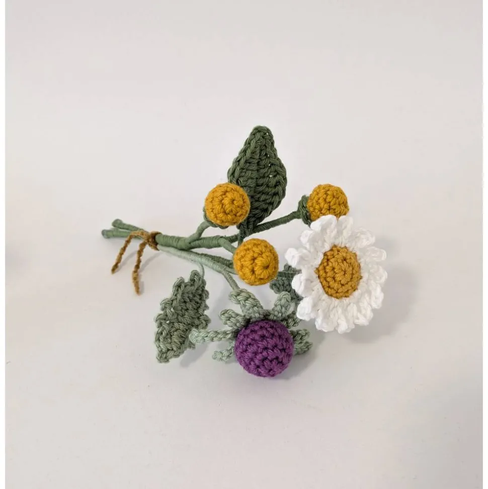 Kleiner gehäkelter Blumenstrauß mit Margerite, Distel & Billy Balls – ideal als Geschenk oder Deko.