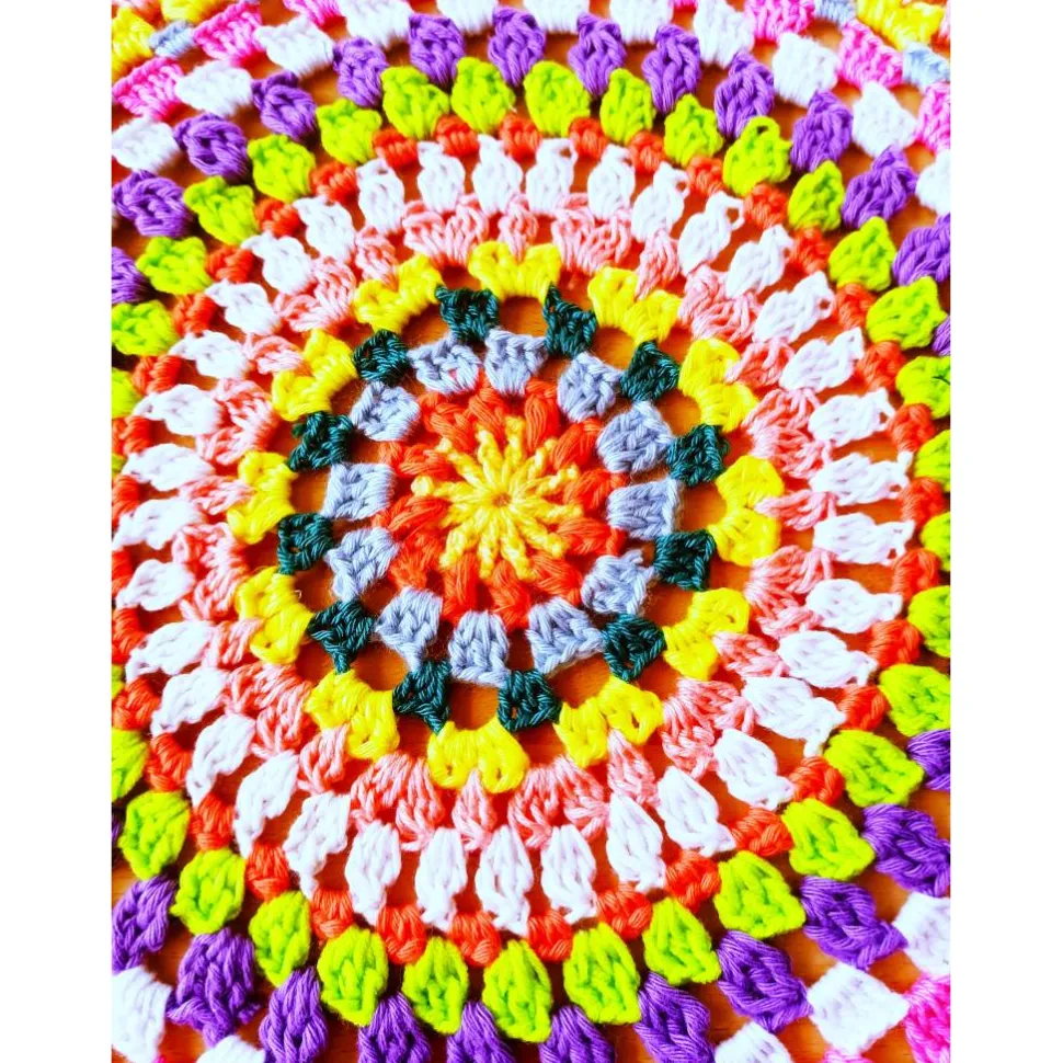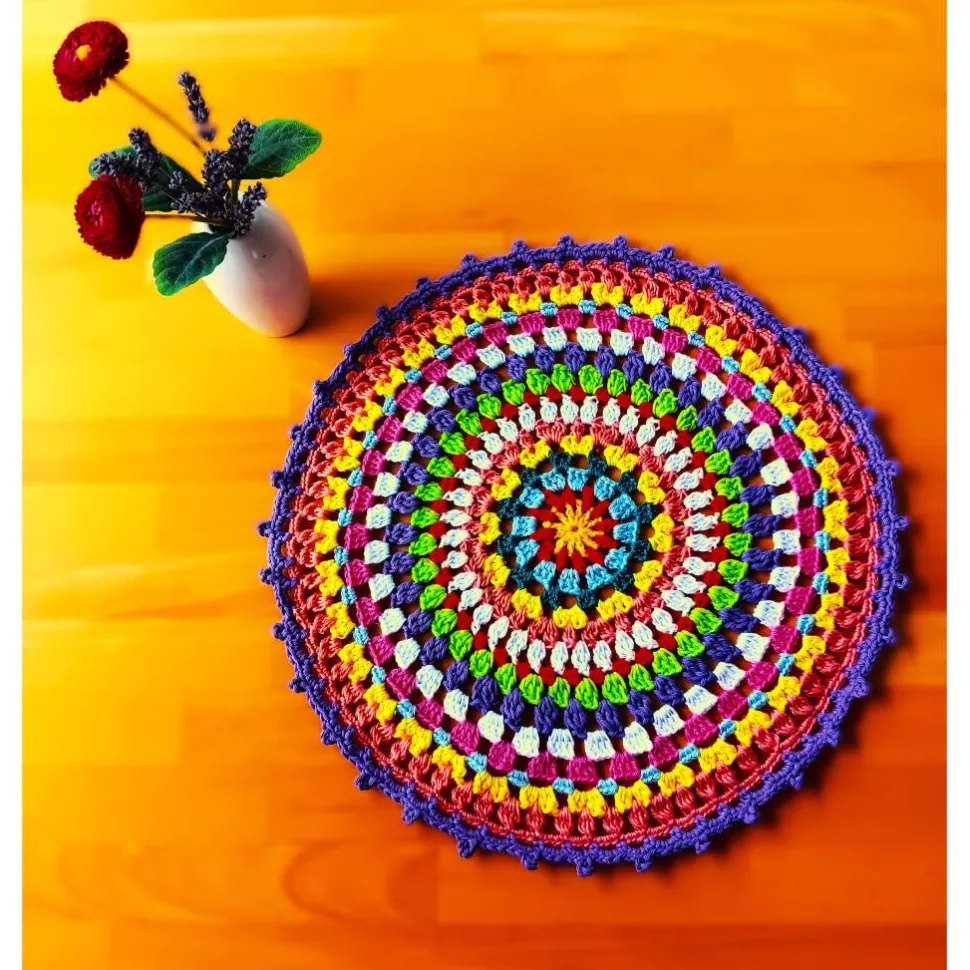 Holt euch die Farben des Frühlings ins Haus. Buntes rundes Häkeldeckchen 37 cm Durchmesser. Mandala in vielen Farben. Helles gelb, orange, hellblau, petrol, gelb, aprikot,weiß, orange, lindgrün, lila, weiß, rosa, hellblau, gelb, aprikot, lila. Die Farben auf den Fotos weichen ein wenig vom Original ab.