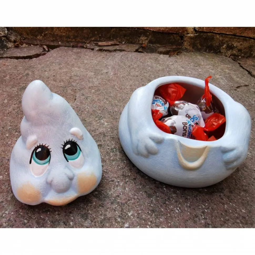 Der Geist ist aus Keramik, hat einen Durchmesser von ca 11cm und ist ca 11cm hoch, handgemalt mit Liebe zum Detail und wetterfest versiegelt. Prima als Bonbondose geeignet