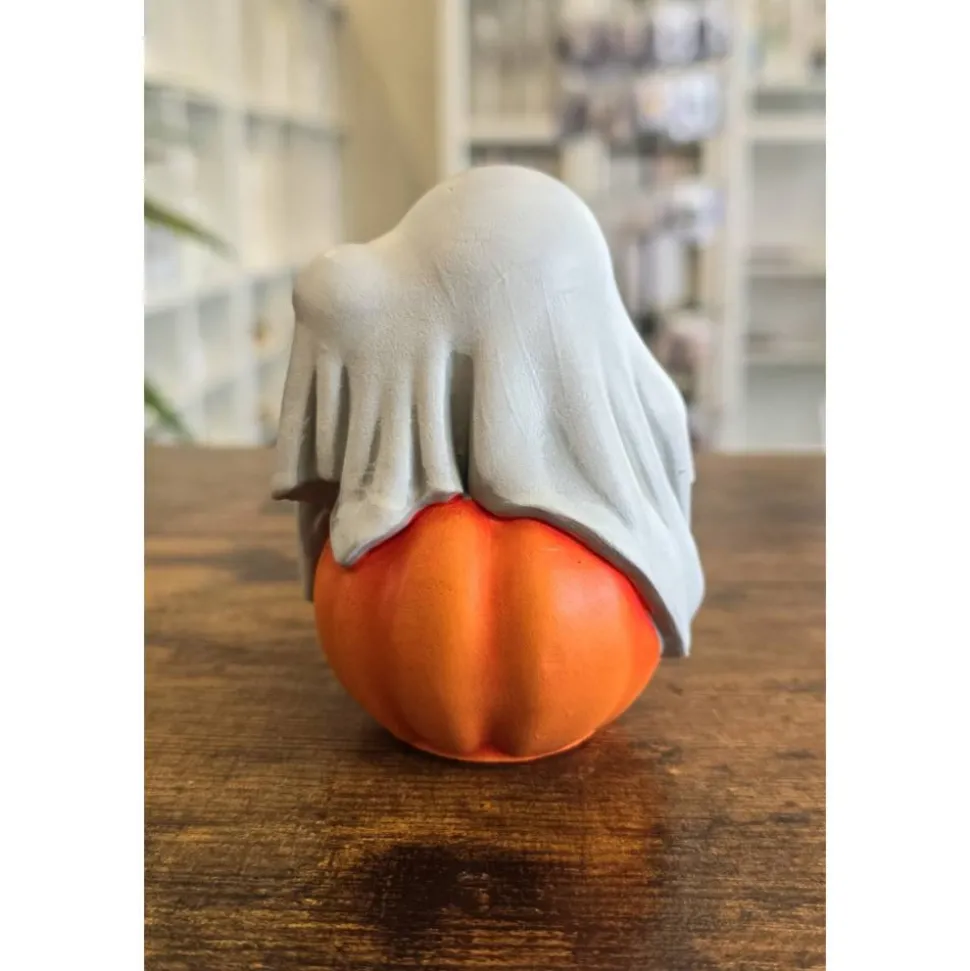 Der kleine Geist auf einem Kürbis wurde handbemalt und ist ca. 6,5×6,0x8,5 cm groß (B/LH)
