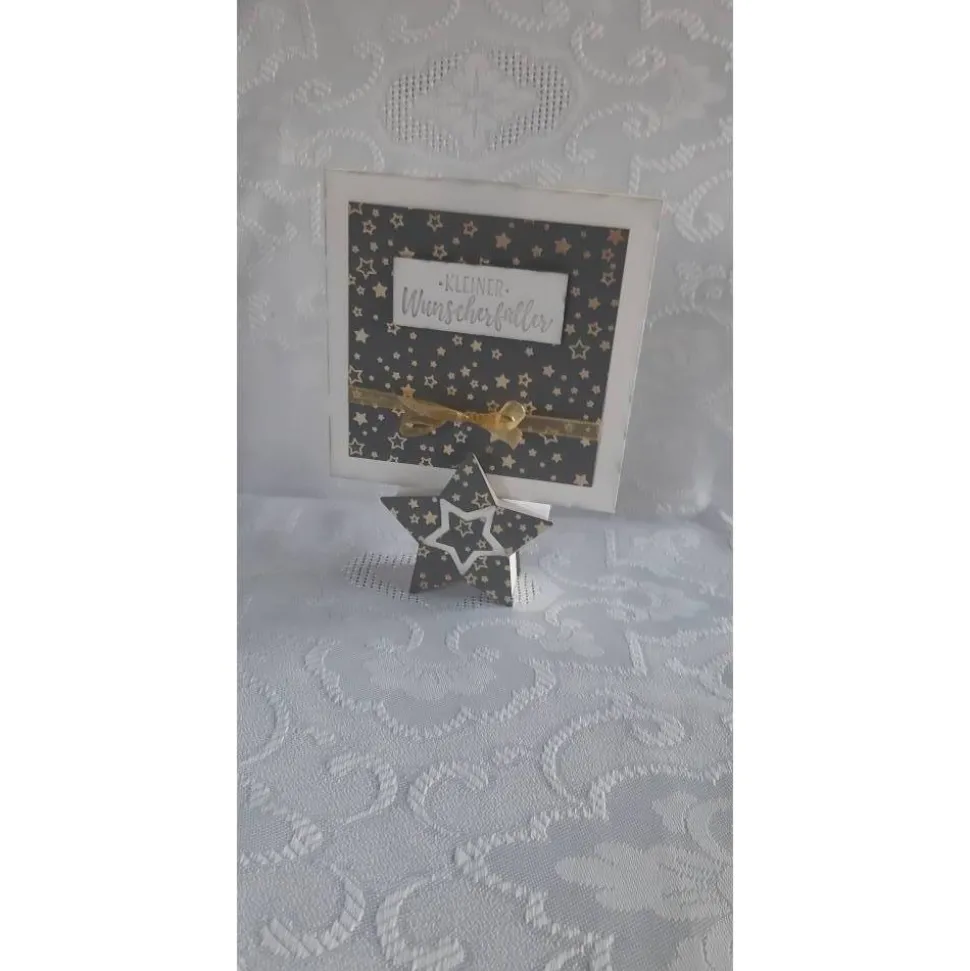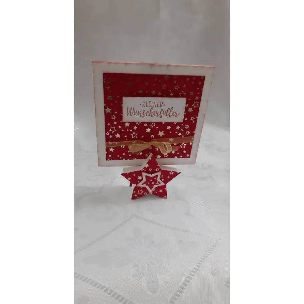 Toller Memohalter in Sternform inclusive passender Karte mit Platz für persönliche Worte und der Möglichkeit im Inneren Geld oder Gutscheinkarten einzustecken. Eine tolle Möglichkeit Geld oder Gutscheine schön verpackt zu überreichen. Wahlweise in rot/gold oder grau/Gold erhältlich