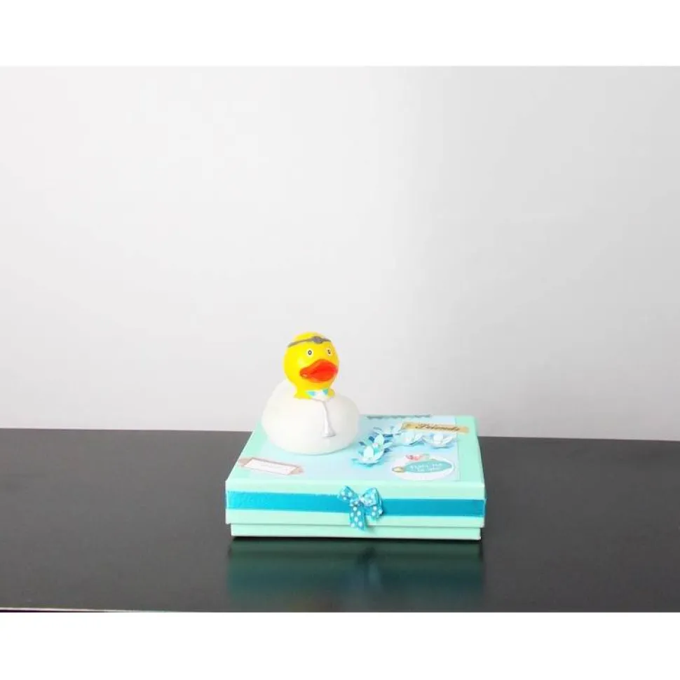 Auf die Box wurde ein süße Ente als Arzt aufgesetzt und liebevoll dekoriert.