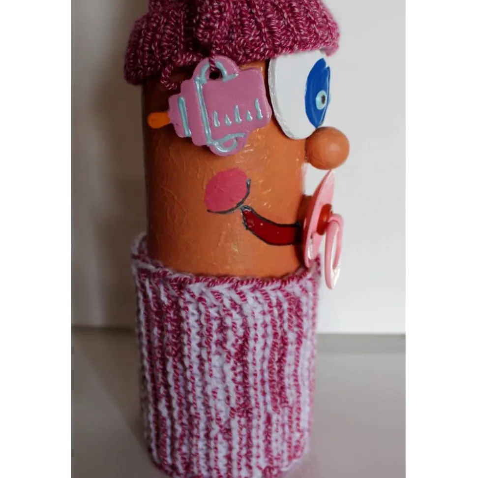 Witzige Figur aus einer Glasflasche. Upcycling-Projekt, gestaltet mit Acrylfarbe und einem handgestrickten Wollmützchen. Verziert mit einer handgestrickten Bauchbinde und einem Babyfläschchen aus Modelliermasse. Kann als Geldgeschenk verwendet werden, wenn man einen Geldschein in die Binde steckt :), siehe Beispielfotos.