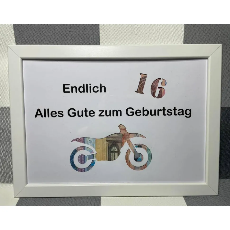 Geldgeschenk Bilderrahmen Geburtstag 16 Motorrad personalisierbar DIN A4