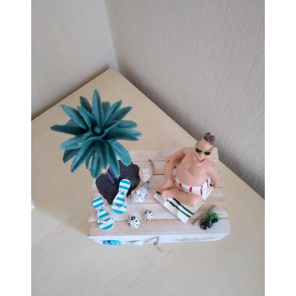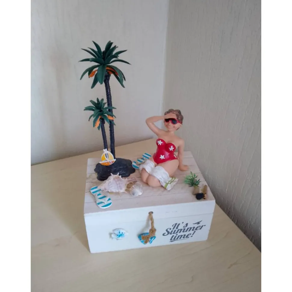 Die weiße Holzbox ist mit dem Aufdruck It´s Summertime versehen und wurde von Hand mit einer Figur, Palme, Fischen, Muscheln, Grasbüscheln und Treibholz gestaltet. Im Inneren erwartet dich weitere detailreiche Dekoration, sodass die Box auch als wunderschöne Schatztruhe für Geldscheine oder kleine Überraschungen dient.