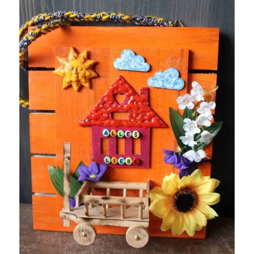 Auf Holz gestaltete Collage. Mit Applikationen aus Holz, Ton und Kunststoff, gestaltet mit Acrylfarben. Der Schriftzug ALLES LIEBE ist mit kleinen Buchstabenperlen am Häuschen angebracht.