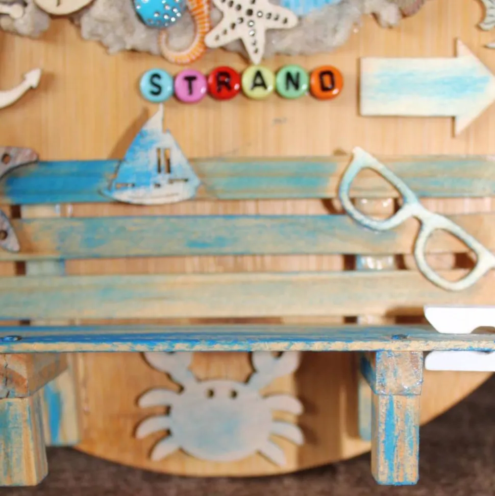 Dekoriert mit Muscheln, Holzornamenten, Kunststoffperlen, Sand und vielem mehr.