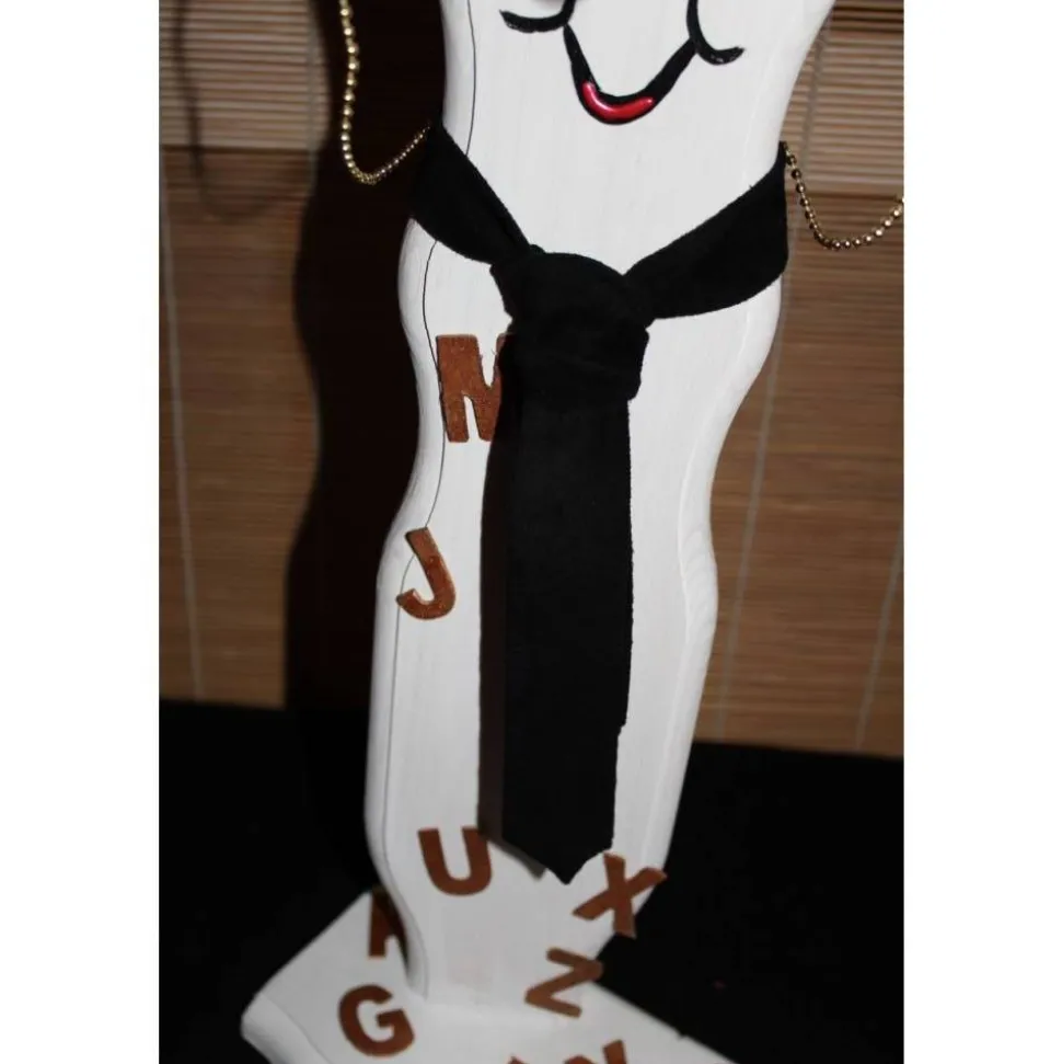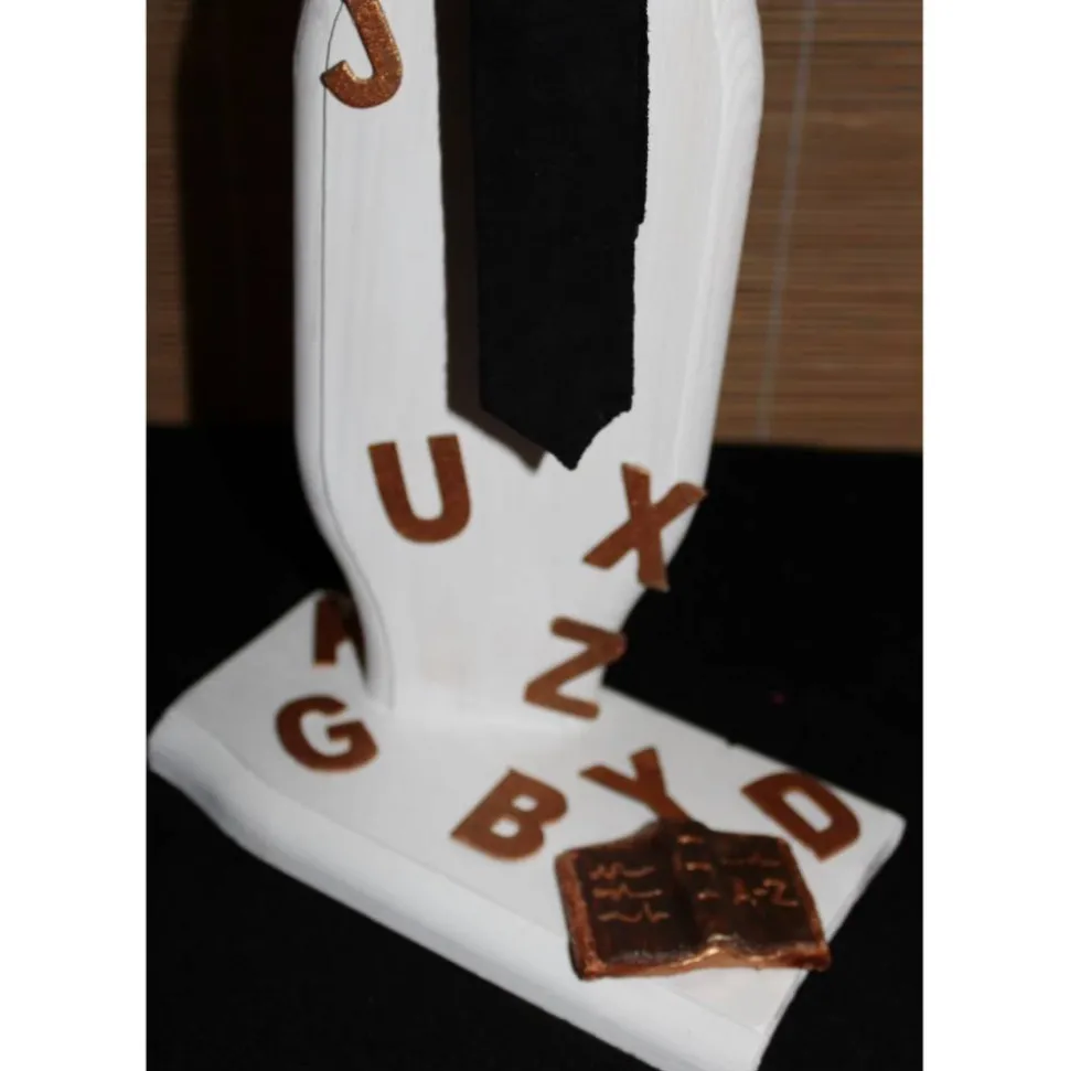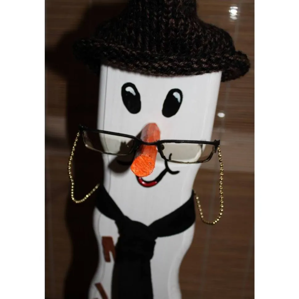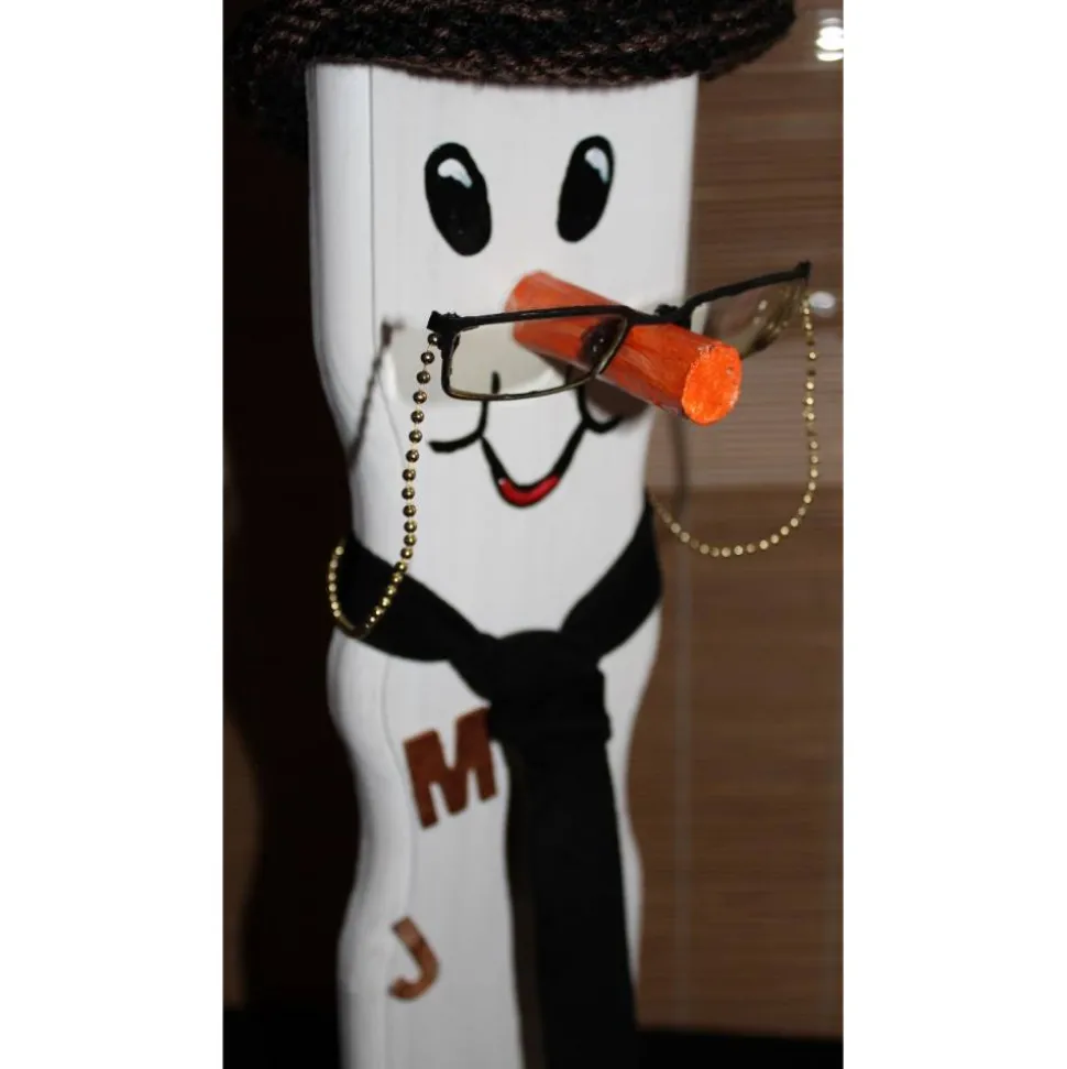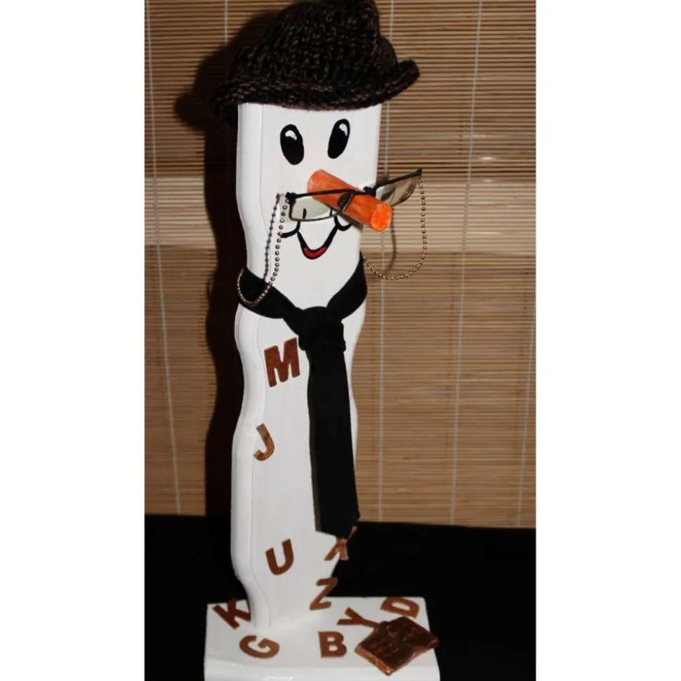 Witzige Schneemann-Figur aus grobem Holz mit Acrylfarben bemalt. Lustige Gestaltung mit Holzbuchstaben, handgestrickter Mütze, Brille und Krawatte, dekoriert mit einem handmodellierten Büchlein aus Ton.