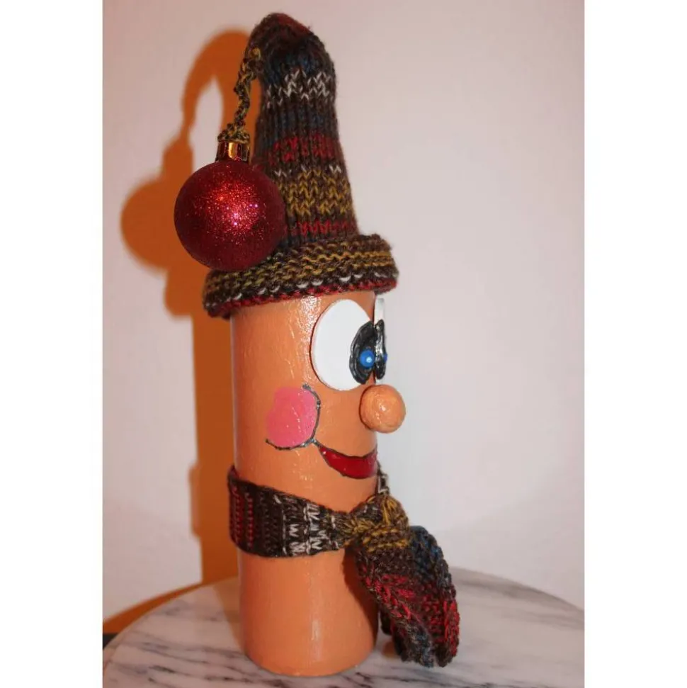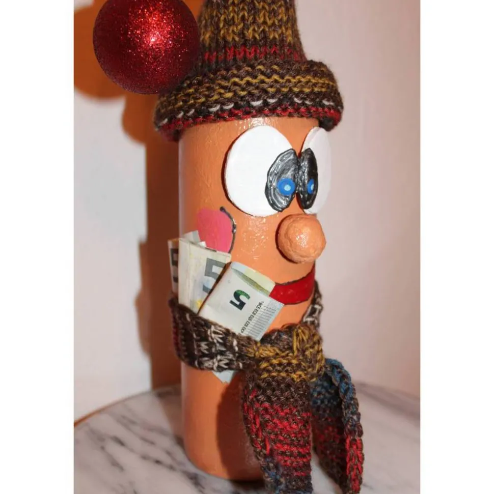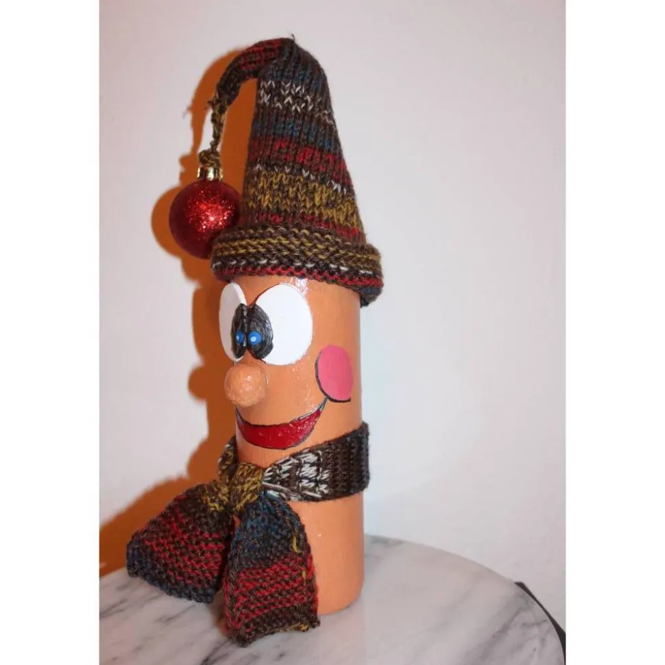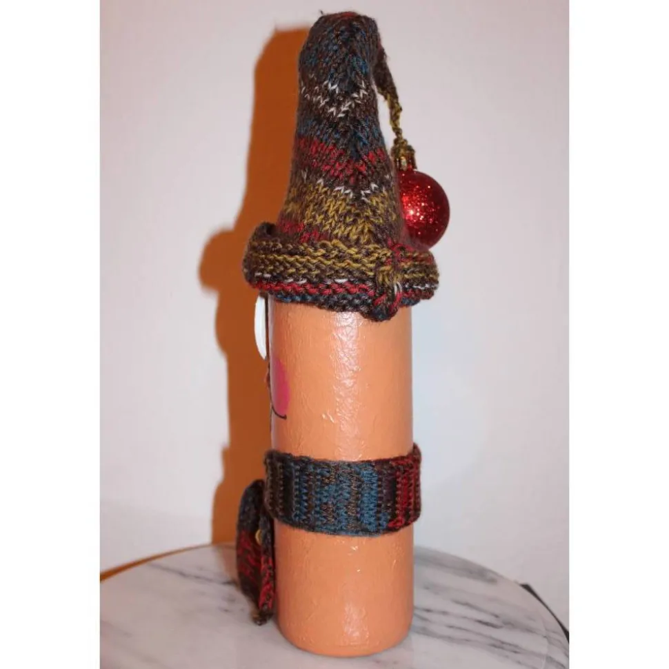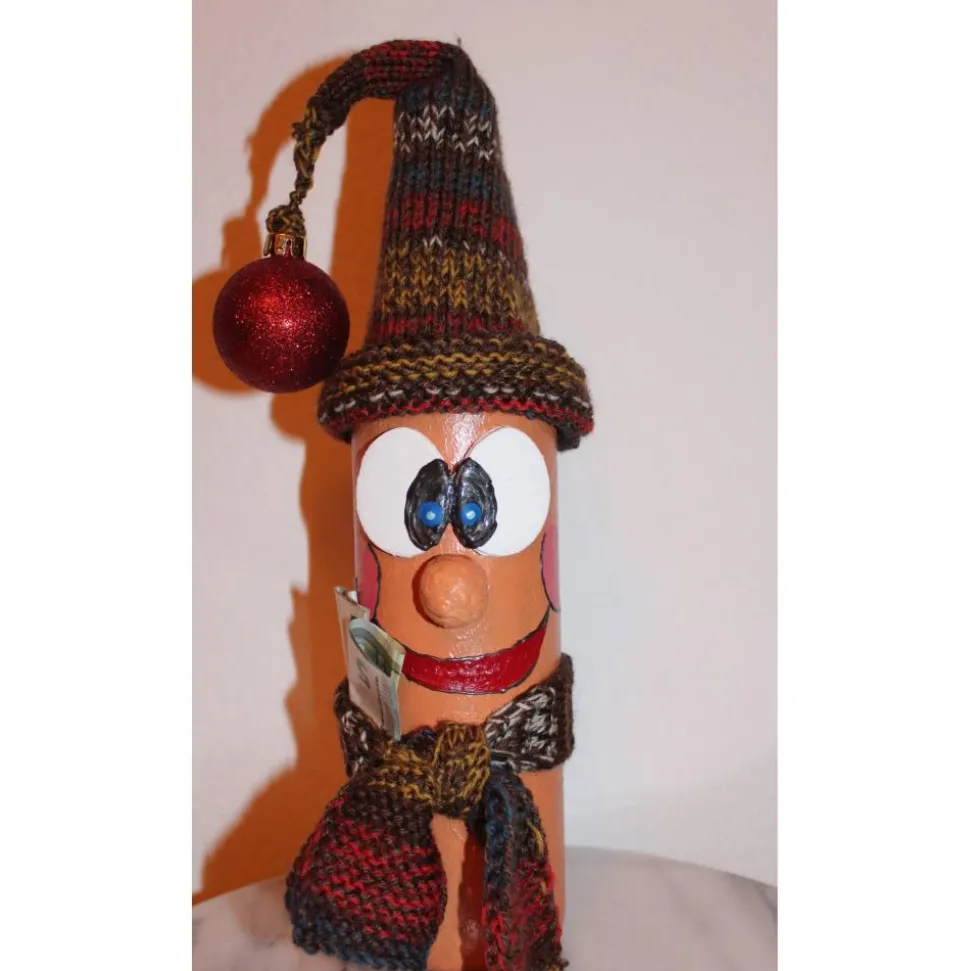 Weihnachtswichtel aus einer Glasflasche. Witziges Upcycling-Projekt, gestaltet mit Acrylfarbe und einem handgestrickten Wollmützchen. Verziert mit handgestricktem Schal und einer Weihnachtskugel. Kann als Geldgeschenk verwendet werden indem man einen Geldschein an in den Schal klemmt :),siehe Detailfotos.