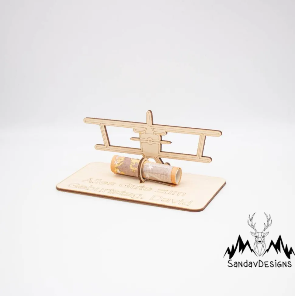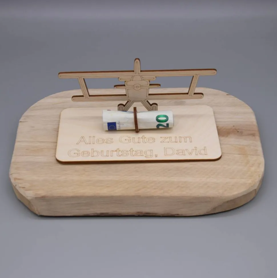 Geldgeschenk Doppeldecker Flugzeug – aus Holz personalisiert
