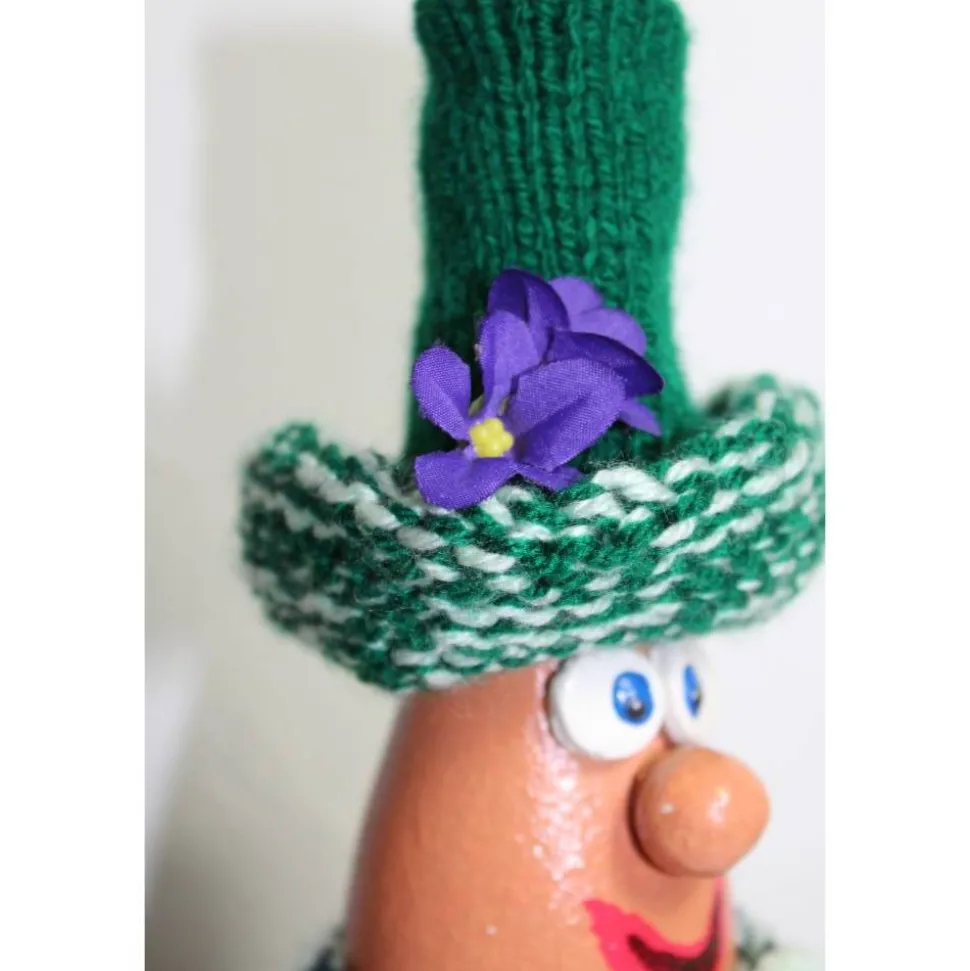 Witzige Figur aus einer Glasflasche. Upcycling-Projekt, gestaltet mit Acrylfarbe und handgestrickten Accessoires. Am Wollmützchen sind künstliche Blüten befestigt. Kann als Geldgeschenk verwendet werden, indem man einen Geldschein in die umgeschlagene Bauchbinde steckt :), siehe Beispielfoto.