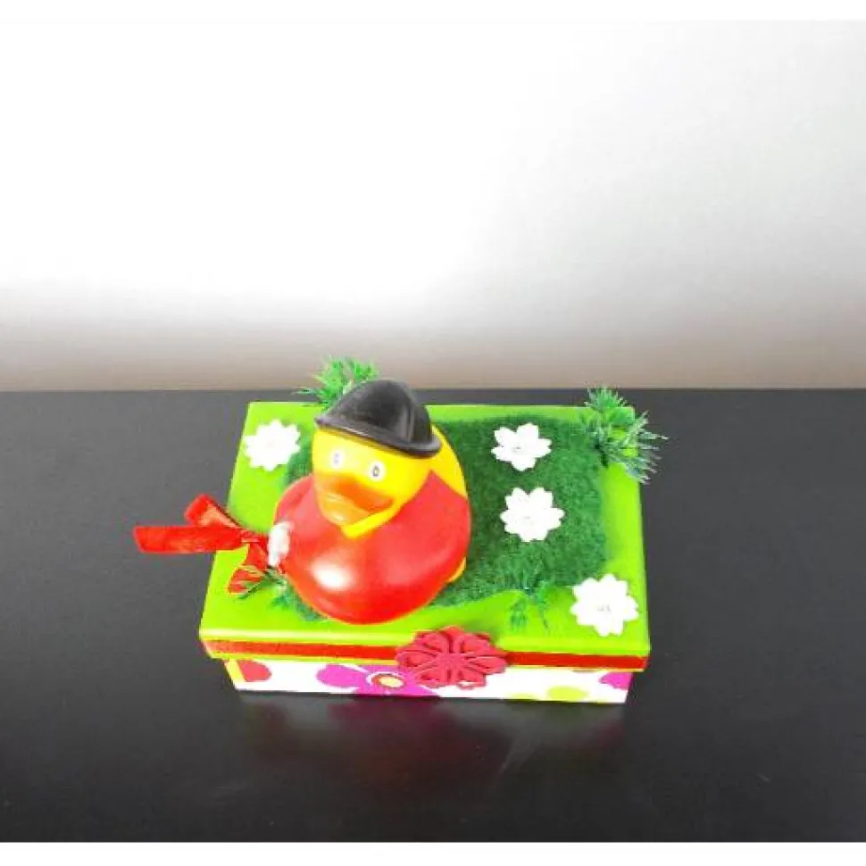 Die Box wurde mit einer süßen Taucher Quietescheente und Blüten verziert.