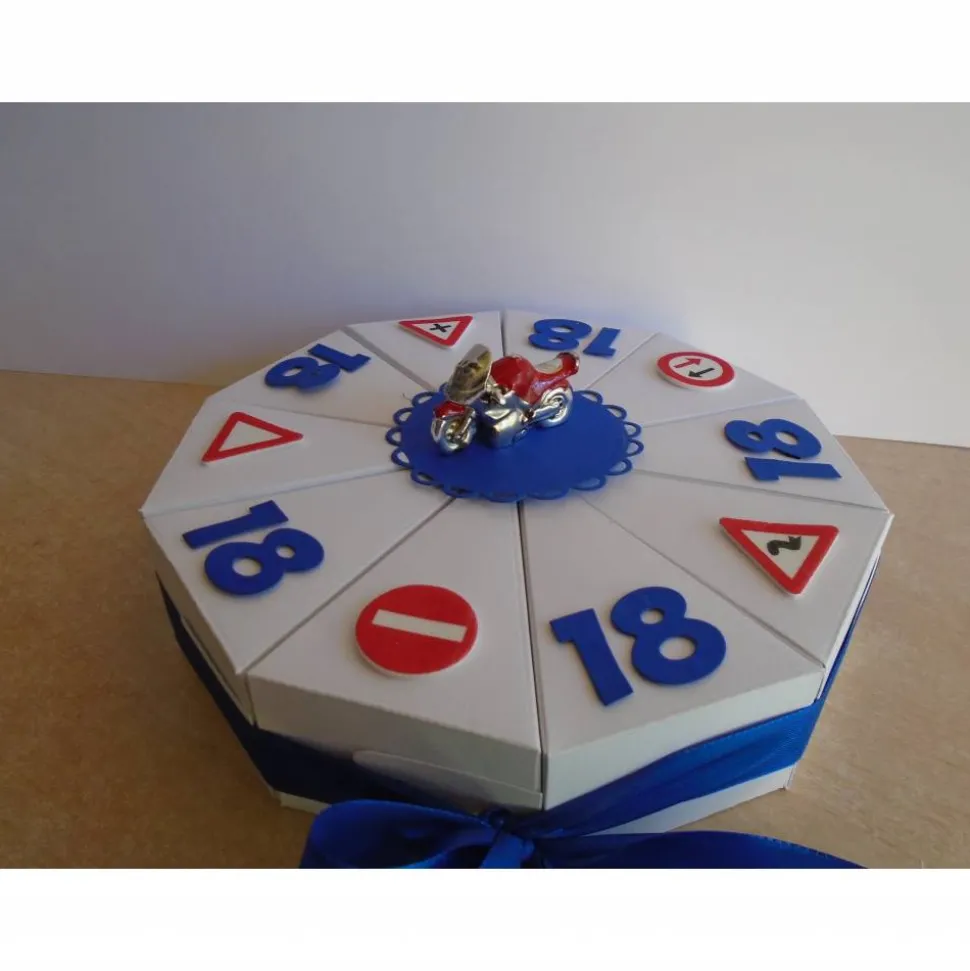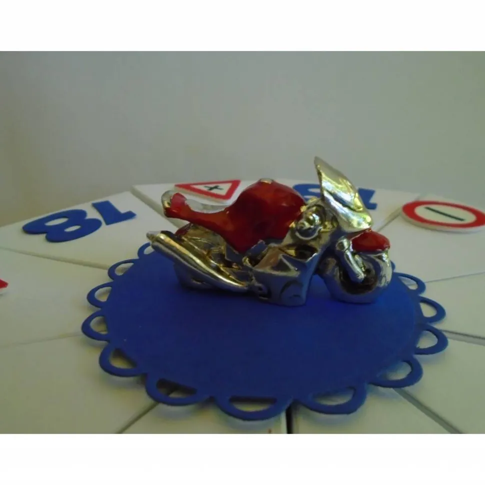 verziert habe ich diese Torte mit einem kleinen Motorrad,gestanzte 18, Verkehrszeichen,Band