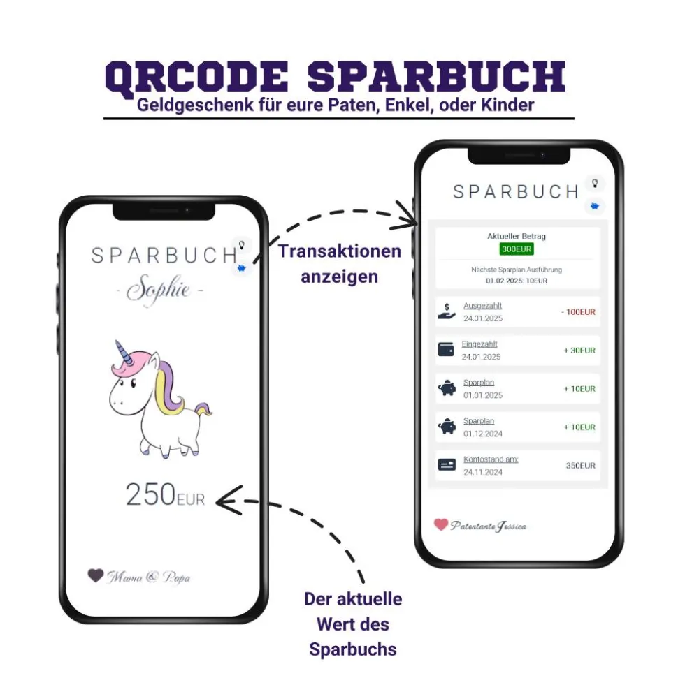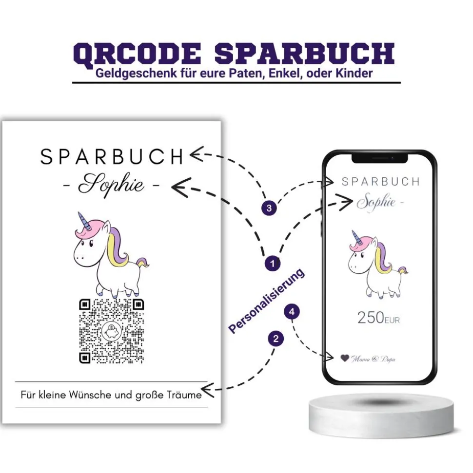 Geldgeschenk für Kinder | Digitales Sparbuch | QrCode Geschenkkarte | Einhorn