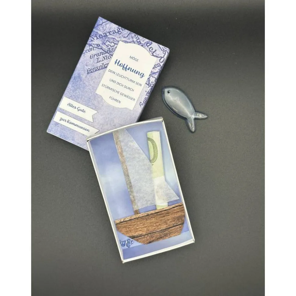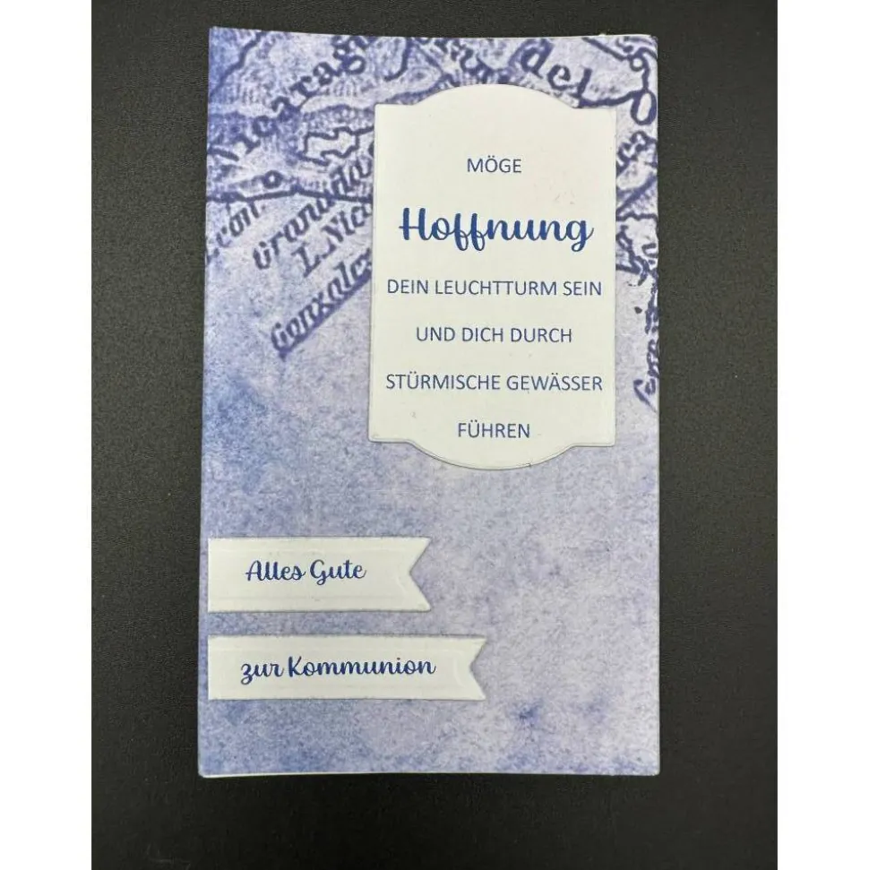 Das Außenteil der Schiebebox wurde mit blauem Designpapier in Landkartenoptik beklebt. Außerdem wurde ein schöner Kommunionspruch und „Alles Gute zur Kommunion“ angebracht.