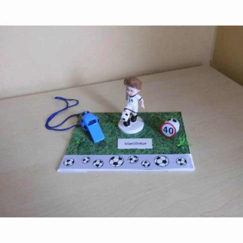 Entdecke die perfekte Geschenkidee für Fußballfans! Dieses kreative Geldgeschenk zum Thema Fußball ist eine liebevoll gestaltete Dekoration, die auf einer stabilen Malpappe mit Rasenmotivkarton gefertigt wird. Die Maße betragen 18 x 13 cm, die Höhe liegt bei ca. 10 cm. Die kleine Fußballszene macht das Präsent zu einem echten Hingucker – ideal geeignet, um Geldgeschenke stilvoll zu überreichen.