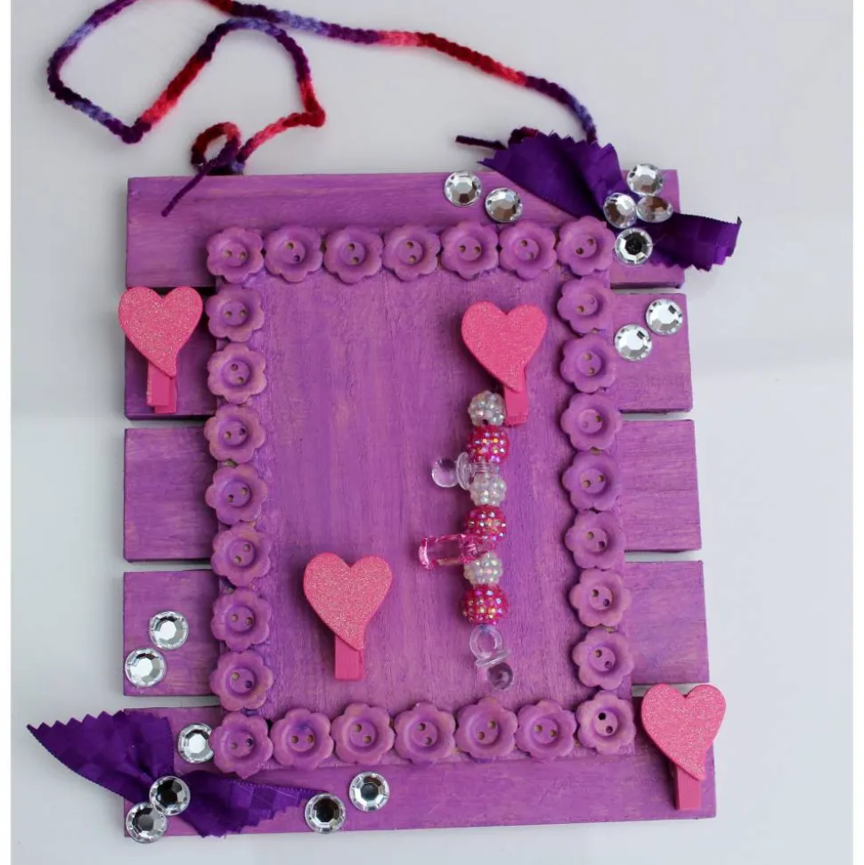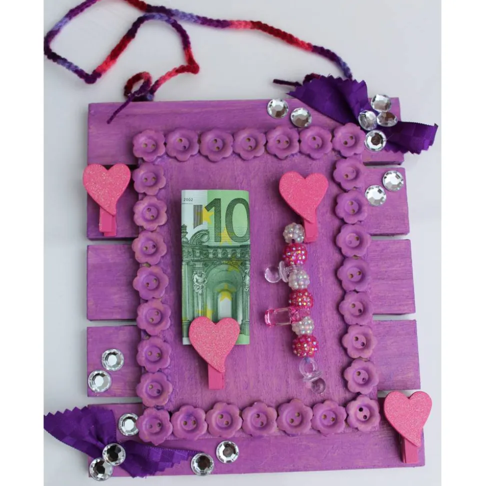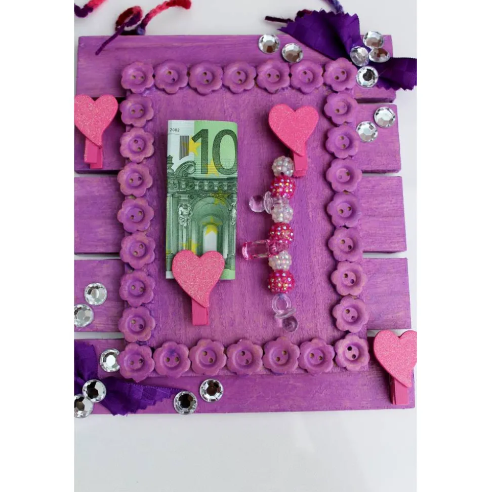 Auf Holz gestaltete Collage für die Geburt eines Mädchens. Mit Knöpfchen, Klammern Glitzersteinen und Stoff verziert. Bemalt mit Acrylfarben.