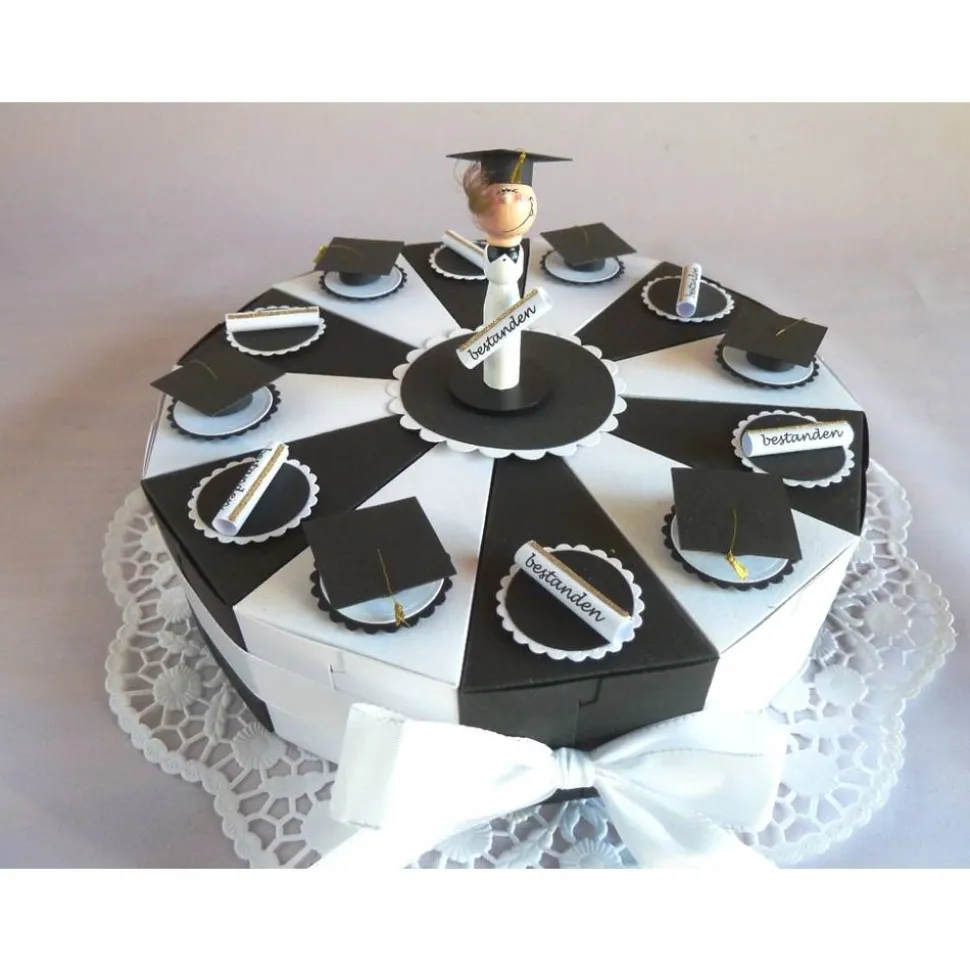 Diese schöne schwarz/weiße Schachteltorte passt super zu diesem Anlass, dekoriert mit je 6 Doktorhüten, Schriftrollen und einer Doktor/Abiturienten-Figur aus Holz in der Mitte.