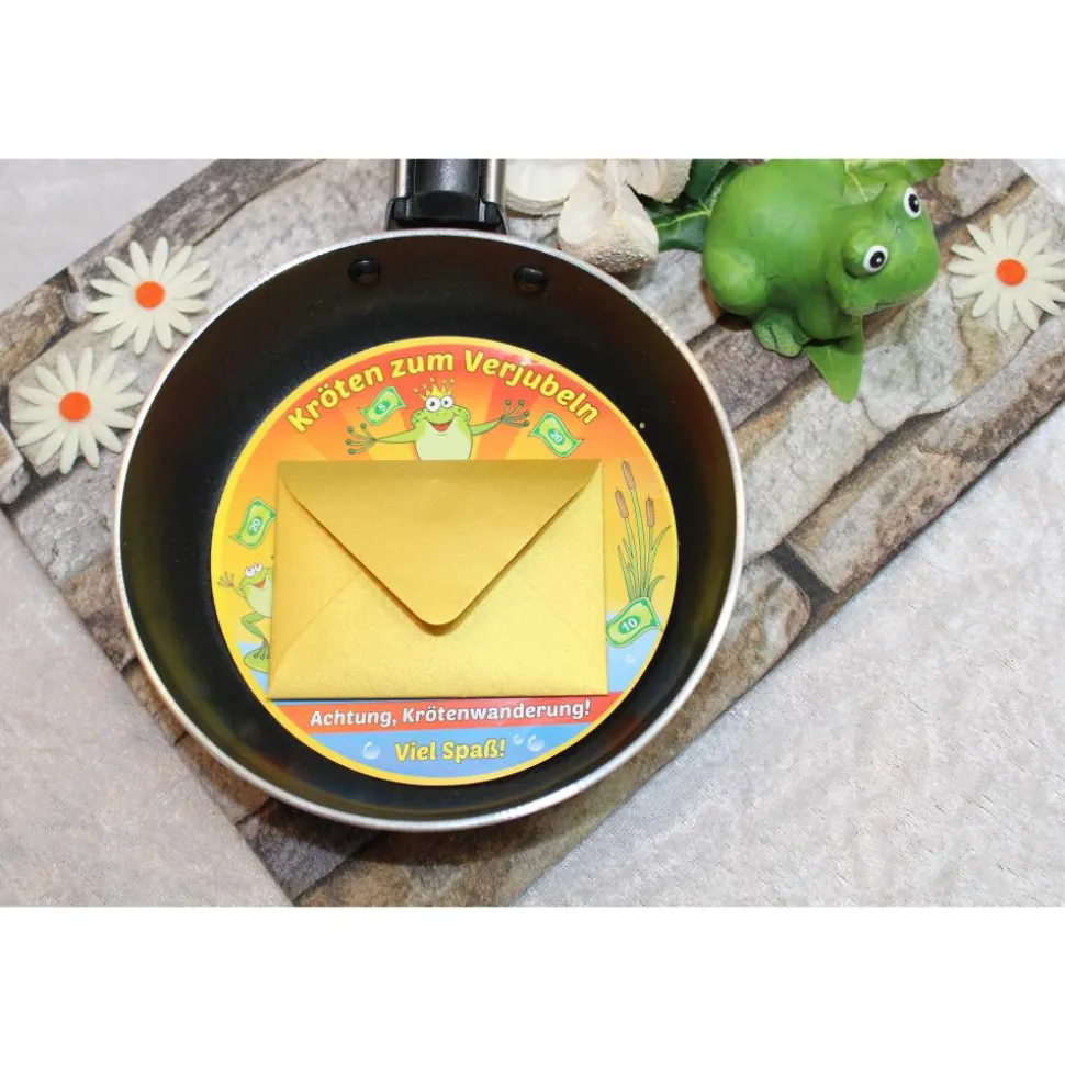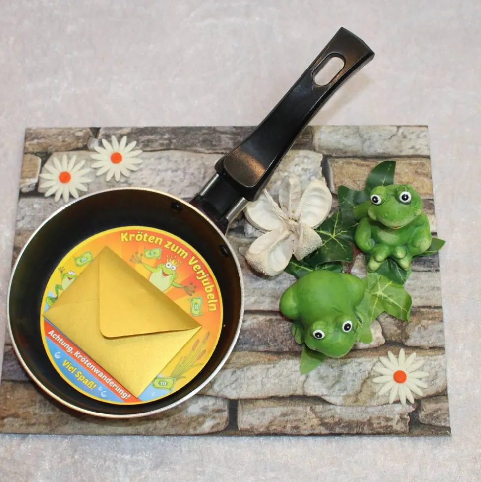 Das Geld wird in den Briefumschlag in der Pfanne gesteckt. Die Pfanne ist für alle Herdarten, außer Induktion, geeignet.
