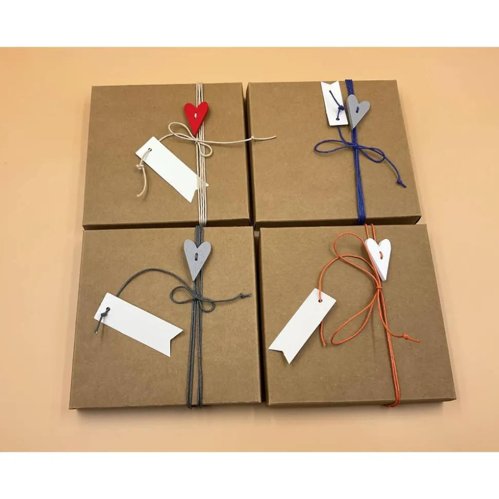 Eine farblich passende Verzierung eine gewachste Schnur mit Holzherz und ein Anhänger aus Pappe welcher auch beschriftet werden kann ziert die Box Außenseite….