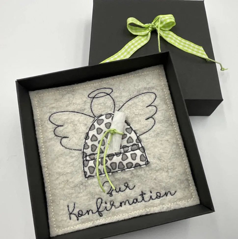 Im Inneren eine bestickte Filzkarte mit seitlichem Einschub für Geld oder eine Botschaft, oder Beides!