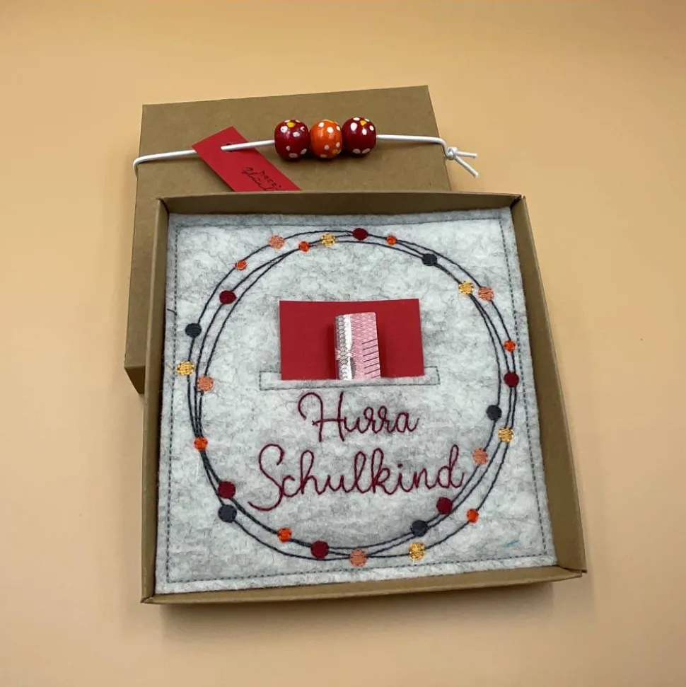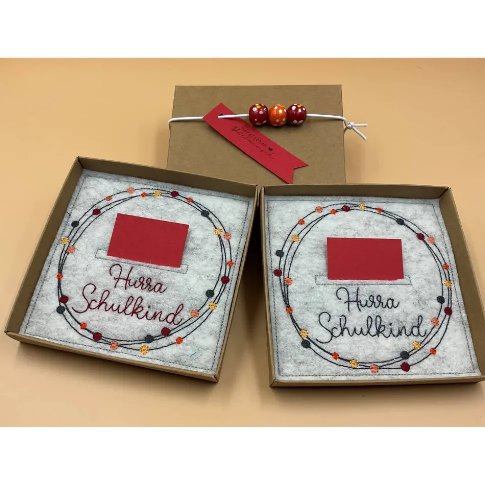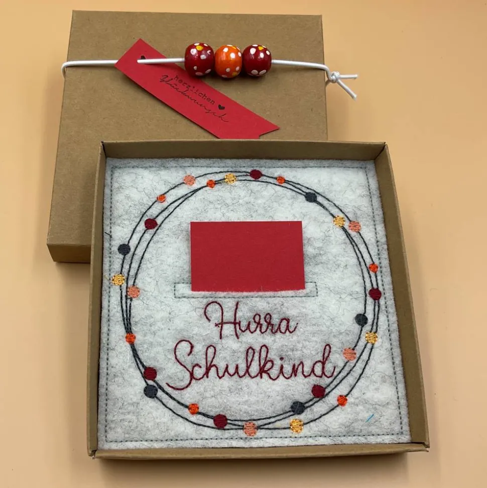 Im Inneren eine bestickte Filzkarte mit seitlichem Einschub für Geld oder eine Botschaft, oder Beides!