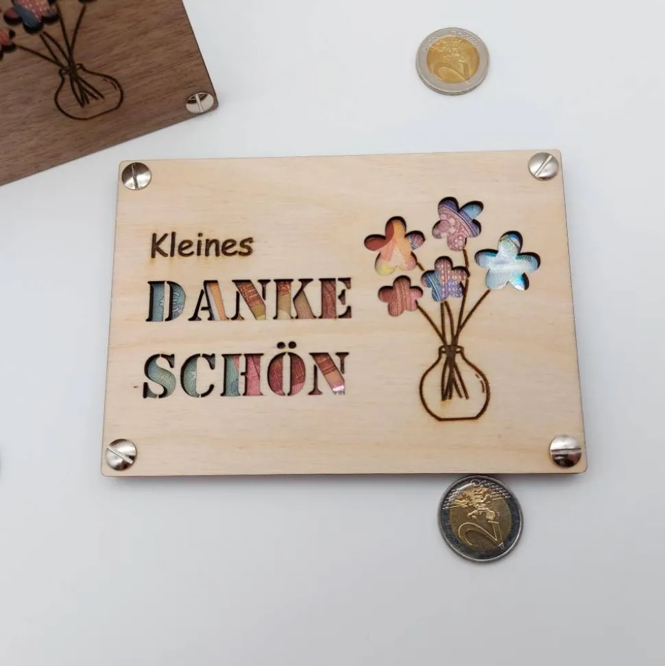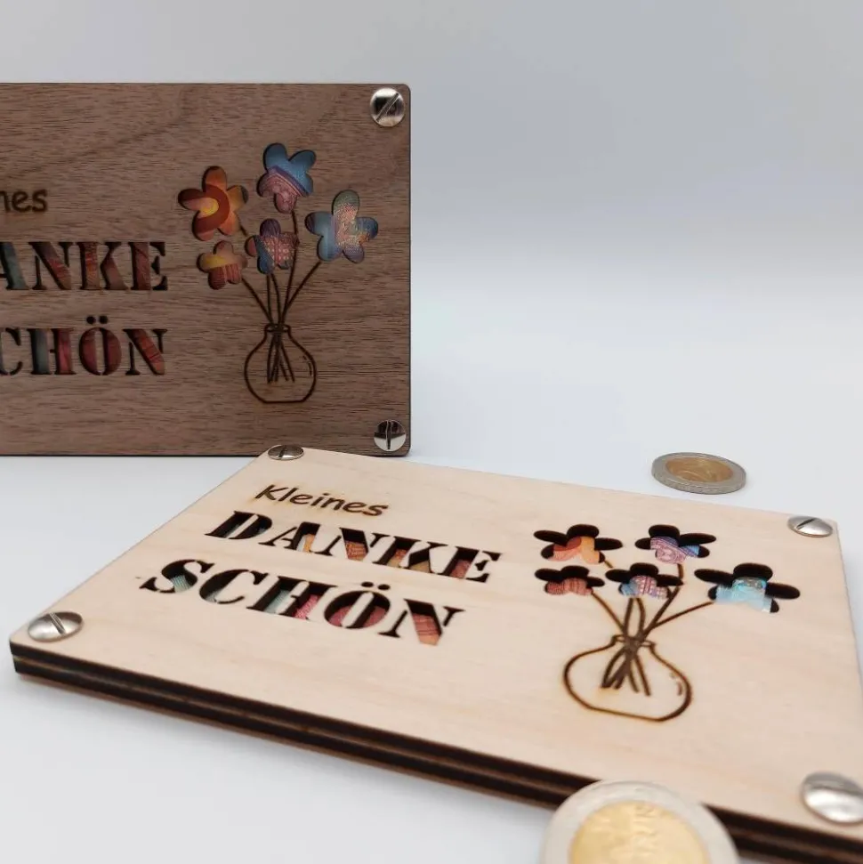 Unsere Geschenkkarte aus Holz bietet dir eine einzigartige und stilvolle Verpackung für Geldscheine.