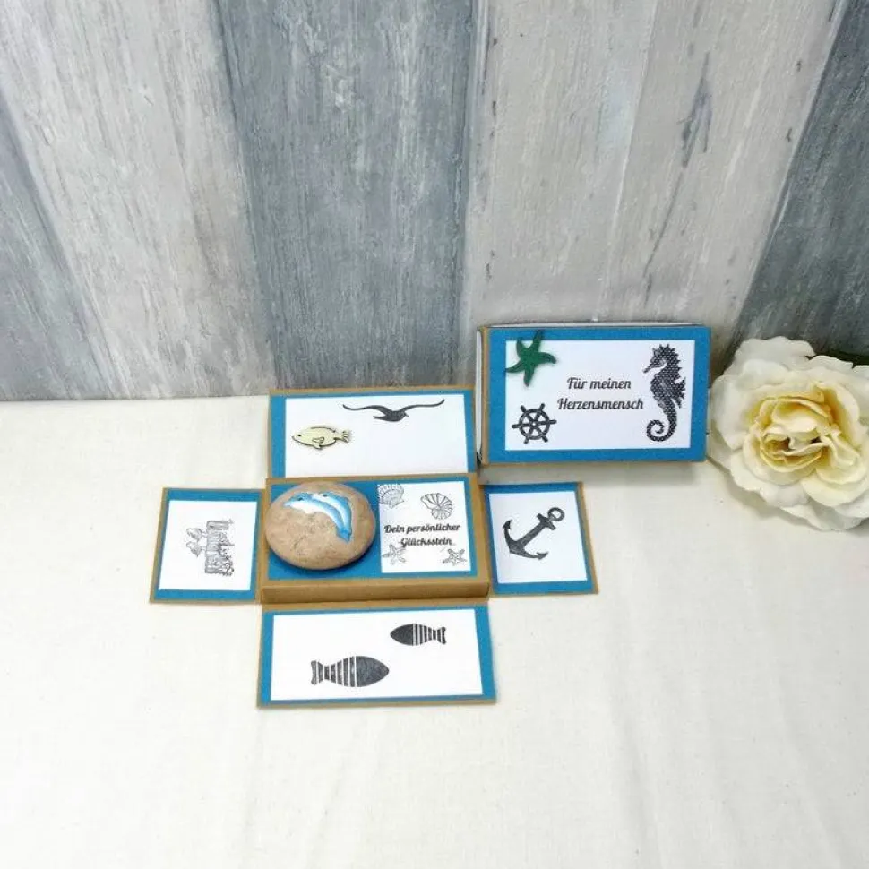 Der Stein hat auf der Vorderseite zwei süße Delfine als Glücksbringer.
