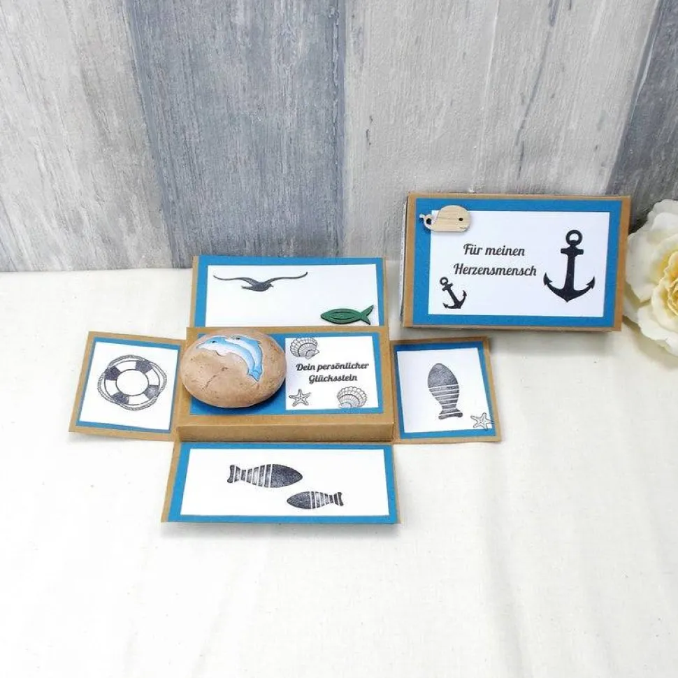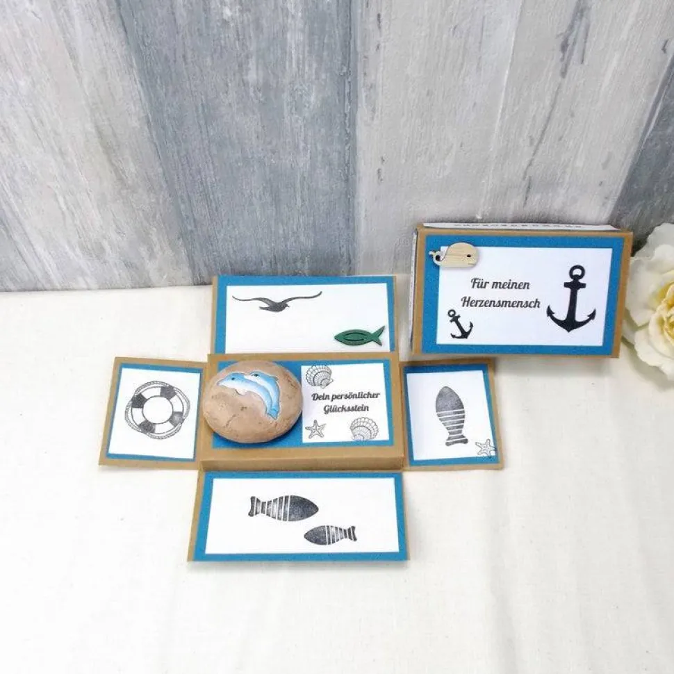 Der Stein hat auf der Vorderseite zwei süße Delfine als Glücksbringer.