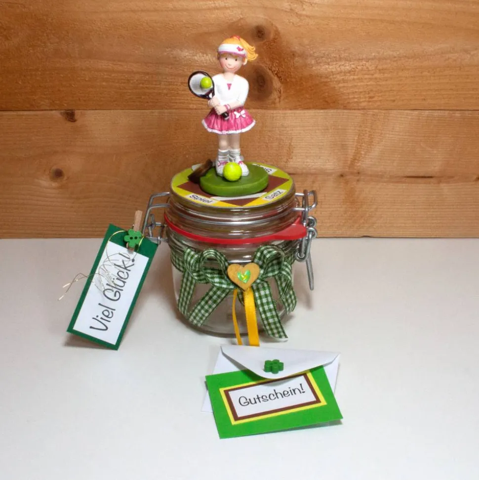 Hübsches mit Liebe gestaltetes Geschenkglas für Geldgeschenke und Gutscheine zum Thema: Tennis, Sport, Hobby, Zubehör, Tenniskurs, usw., mit einer kleinen Karte und Umschlag für ein paar persönliche Zeilen.