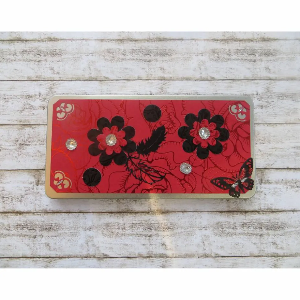 Die Geldgeschenkverpackung, Dose, Gutscheinverpackung ist mit hochwertigem bedrucktem Kartenkarton, Blumendekor, Glitzersteinchen und Stanzelementen verziert.