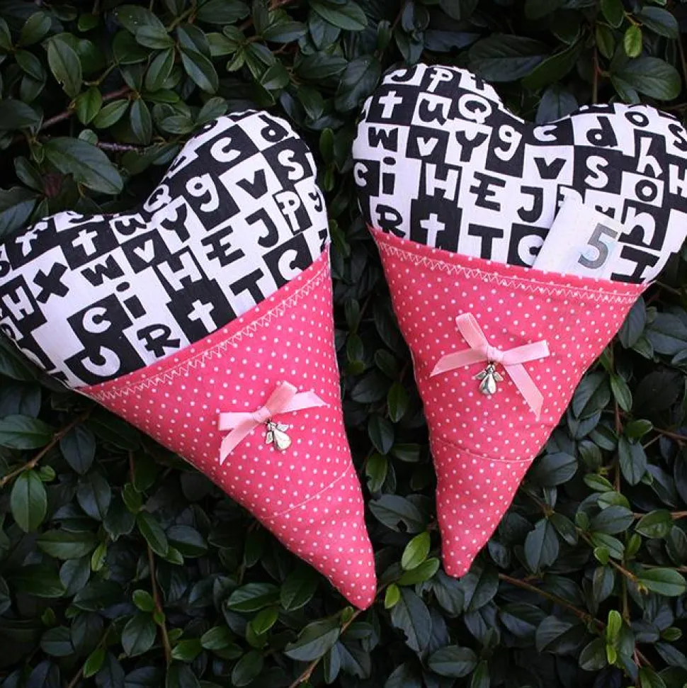 Das Kissen wurde von Hand genäht, passend zum Schulanfang wurde ein toller Buchstabenstoff mit anderen Baumwollstoffen kombiniert. Ein Schleifchen mit einem Schutzengel runden das Ganze ab. Individuell, persönlich und von Herzen.