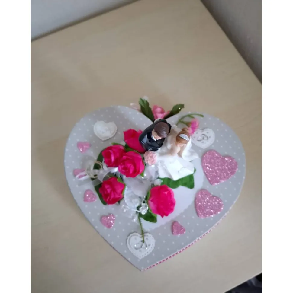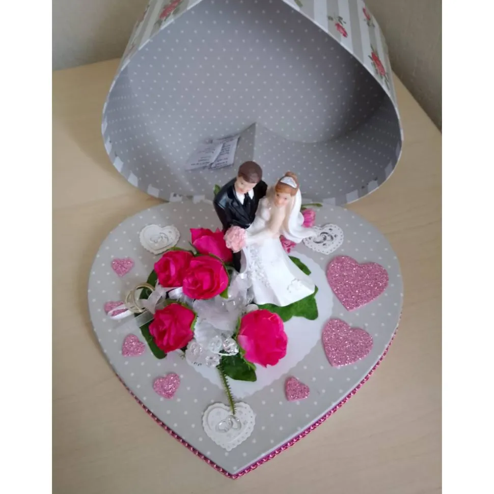 Überrasche das Brautpaar mit einem einzigartigen Geldgeschenk zur Hochzeit! Die liebevoll dekorierte Herzbox mit Brautpaar ist ein außergewöhnliches Präsent, das garantiert in Erinnerung bleibt. Auf der stilvollen Geschenkbox in Herzform arrangiere ich für dich eine wunderschöne Blumendeko, Trauringe und weitere edle Dekoelemente rund um das Brautpaar.