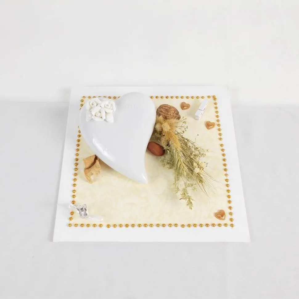 Material: Unterlage, Keramikherz, Trockenblumensträußchen, Geldscheinklammer, Dekorationen
