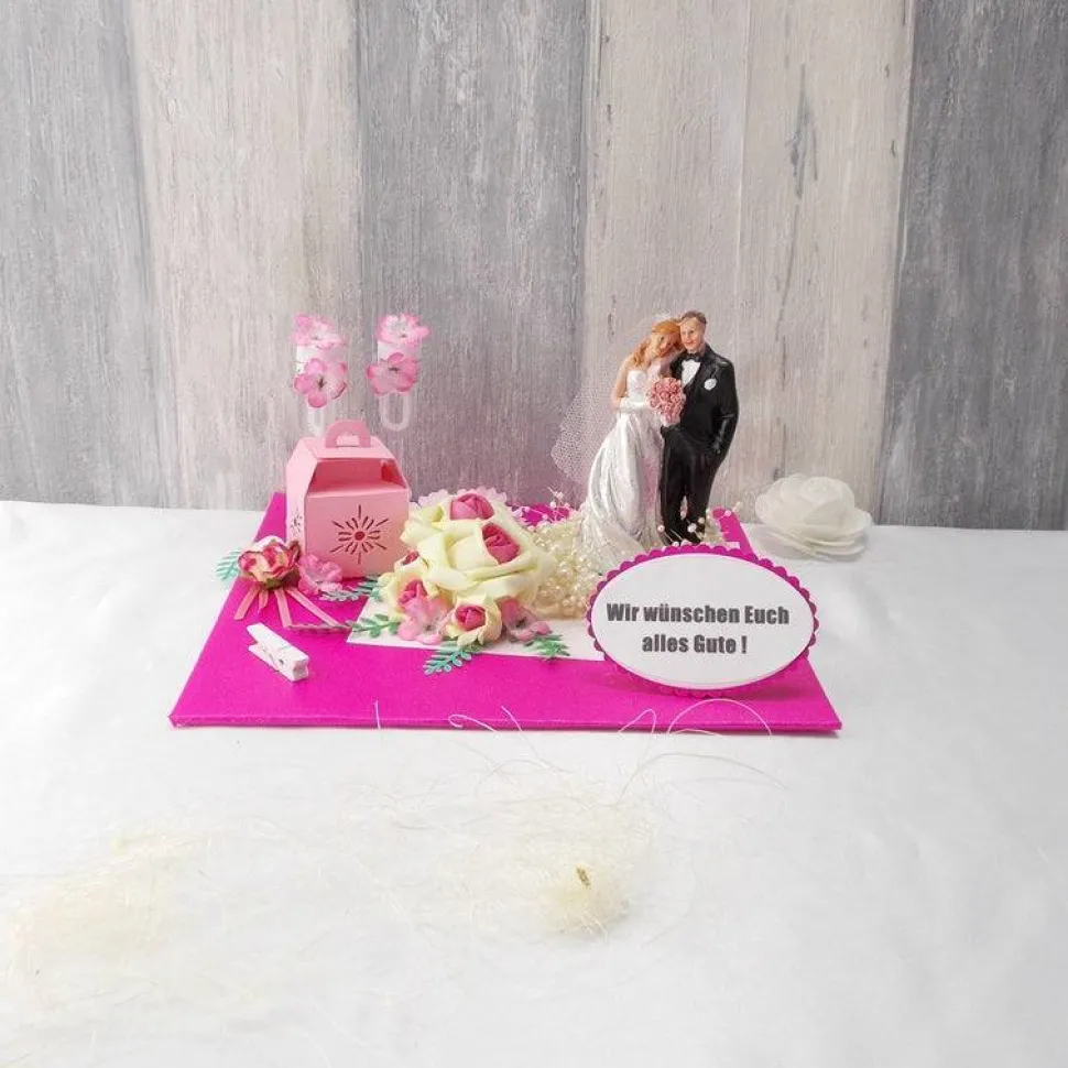 Material: Unterlage, Papier, Deko, Brautpaarfigur, Box, Seifenblasenkelche