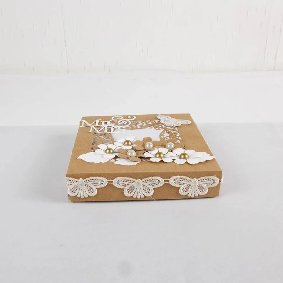 Edle Box in Naturtönen und weiß, der Deckel wurde üppig mit Ausstanzungen und Blüten dekoriert. Links oben wurde der Schriftzug „Mr und Mrs „aufgesetzt..
