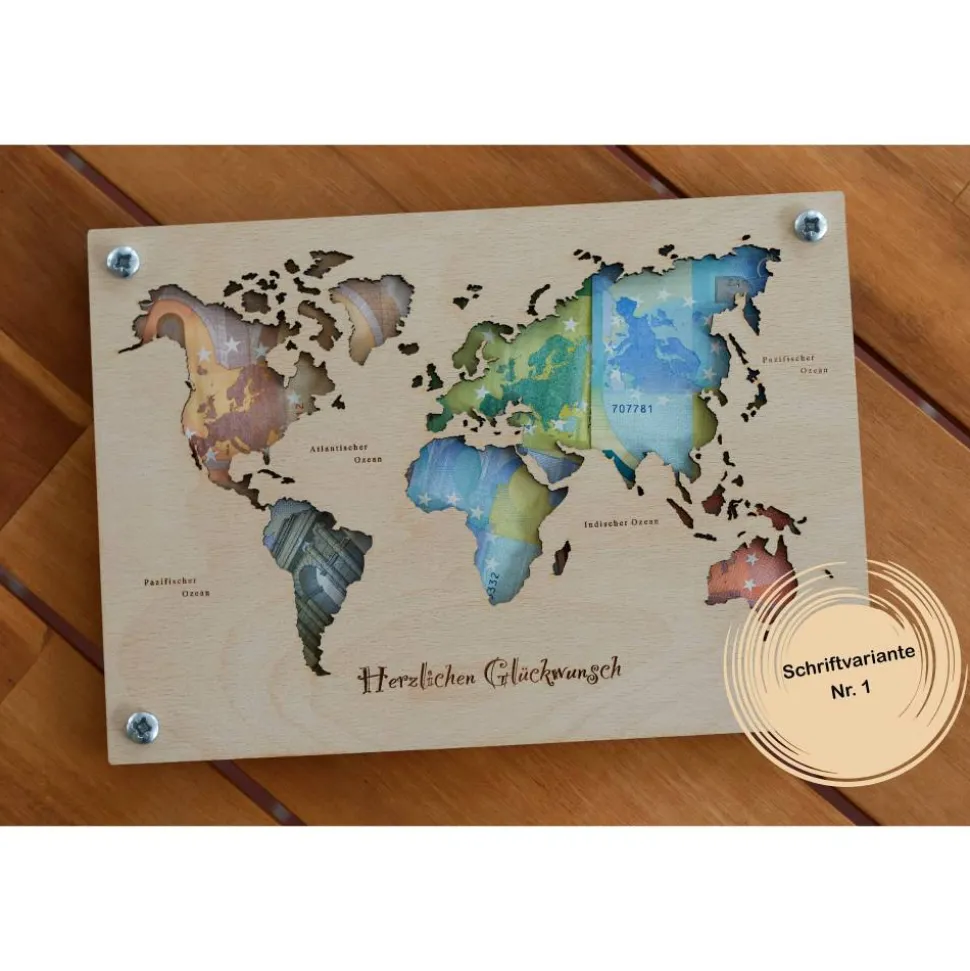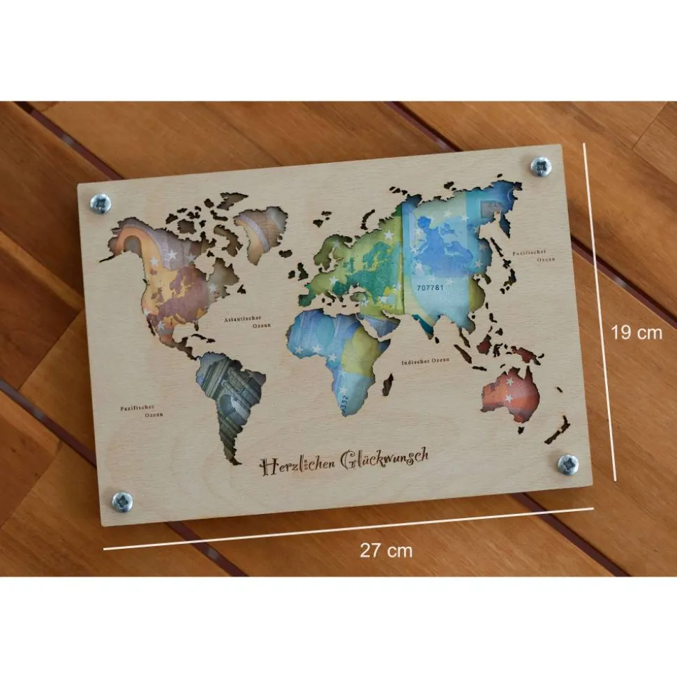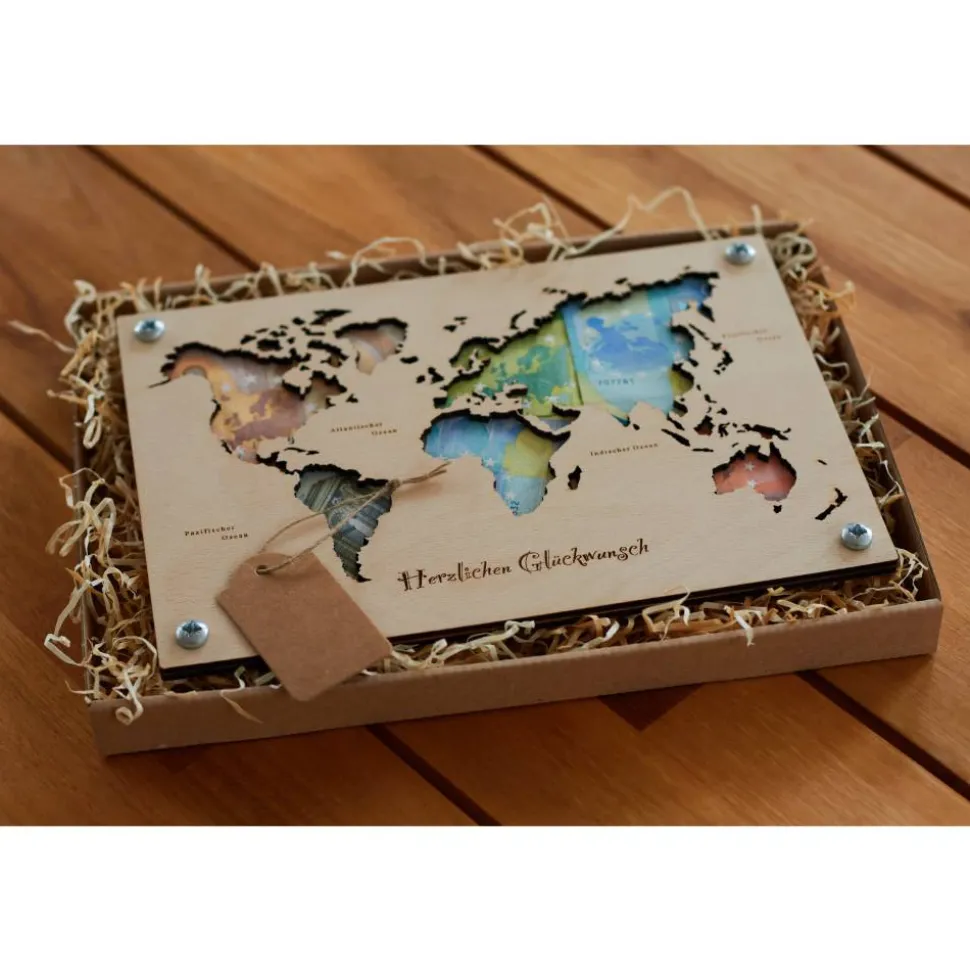 Entdecke unsere Holz Weltkarte, ein einzigartiges Geldgeschenk für besondere Anlässe wie Hochzeiten oder Geburtstage. Diese detailreiche Karte dient nicht nur als originelle Reisekasse für die Hochzeitsreise oder den nächsten Urlaub, sondern auch als stilvolle Dekoration für Zuhause. Gefertigt aus Holz ist diese Weltkarte nicht nur ein praktisches Geschenk, sondern auch ein beeindruckendes Kunstwerk, das die Schönheit der Welt in deinen Wohnraum bringt.