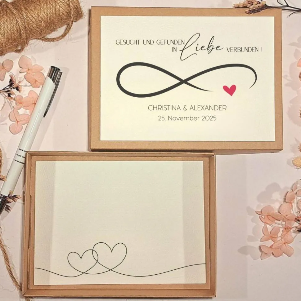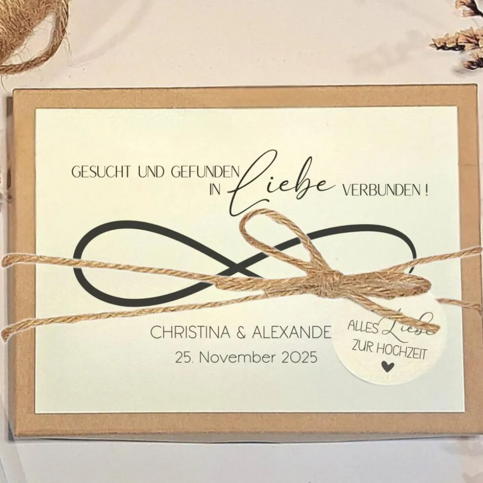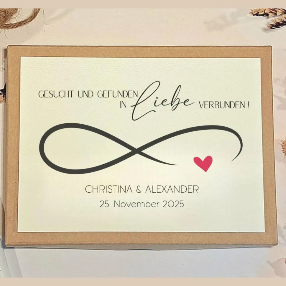 Die Box wird mit dem Namen des Brautpaares sowie dem Hochzeitsdatum personalisiert und besticht durch ihr elegantes Infinity-Zeichen. Ein Baumwollsäckchen bietet Platz für dein Geldgeschenk oder kleine Aufmerksamkeiten. Zusätzlich liegt eine Karte für persönliche Glückwünsche bei.
