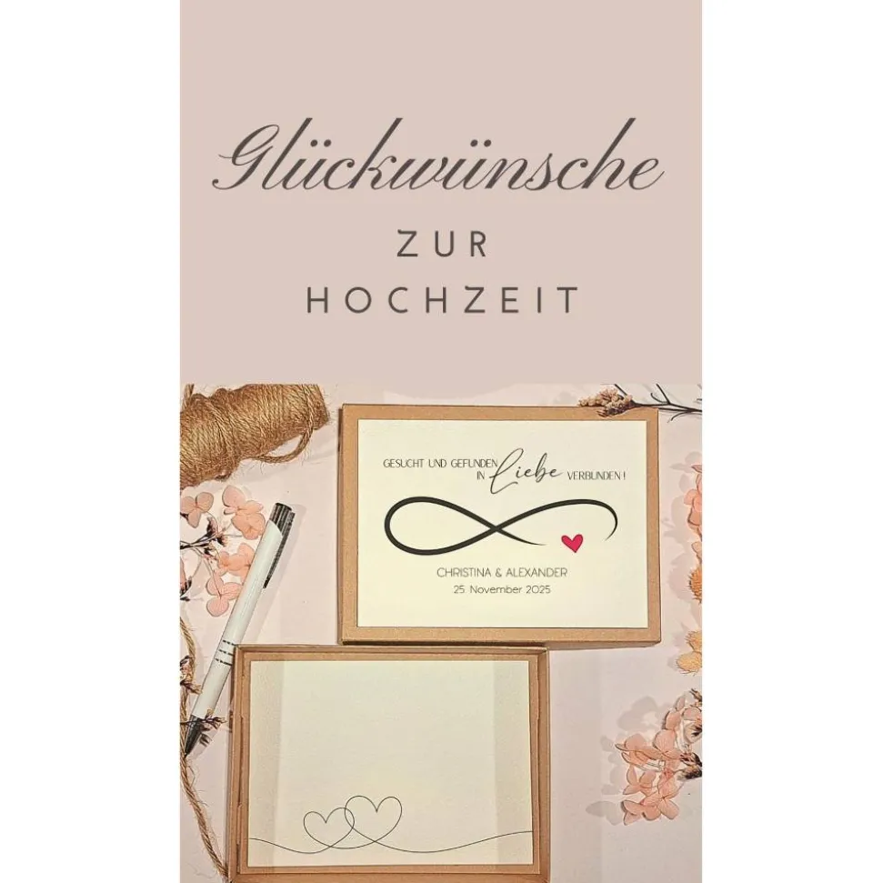 Verschenke einzigartige Freude mit einer personalisierten Geldgeschenkbox zur Hochzeit! Diese stilvolle Geschenkbox vereint das bedeutungsvolle Infinity-Symbol mit dem liebevollen Spruch „Gesucht und gefunden in Liebe verbunden“. So überreichst du dein Geldgeschenk auf besonders elegante und emotionale Weise.