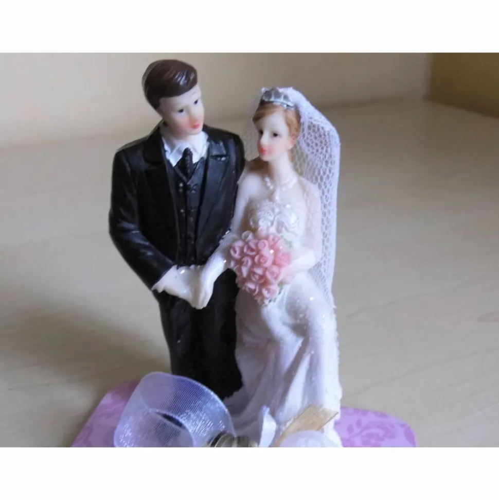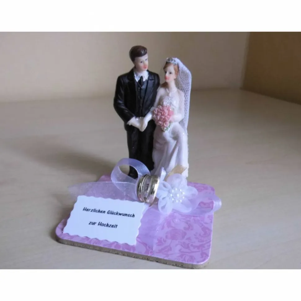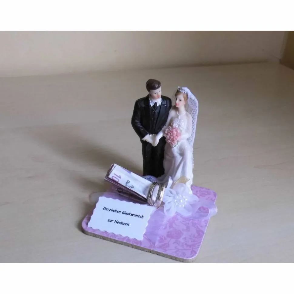 Das Geldgeschenk ist auf einem Korkuntersetzer mit hübschem Blumenrankenmotiv arrangiert. Ein schönes Brautpaar ziert die Szene und macht das Geschenk zu einem echten Blickfang. Die Dekoration wird durch eine elegante Chiffonschleife, eine zarte Chiffonblüte, Kunststoff-Eheringe und ein Schild mit der Aufschrift „Herzlichen Glückwunsch zur Hochzeit“ abgerundet. Deinen Geldschein kannst du einfach zusammengerollt oder gefaltet in die Ringe schieben – so wird er originell und liebevoll überreicht.