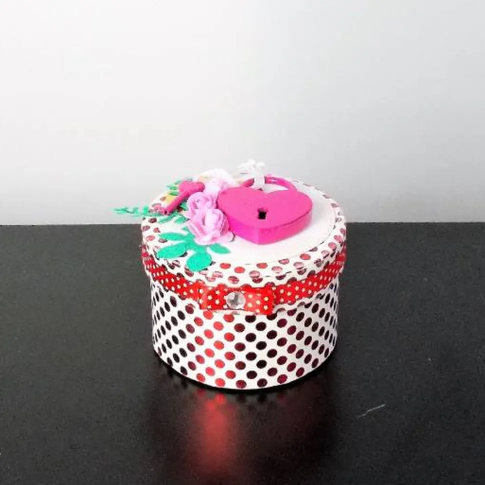 Dieses hübsche Geldgeschenk ist ein Hingucker, es wurde liebevoll mit einem Liebesschloss und Blüten verziert. Der Deckel ist mit zartem Satinband umfasst.