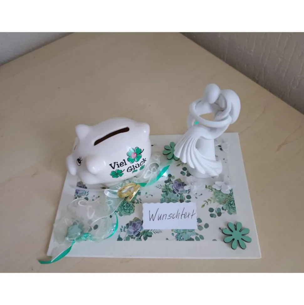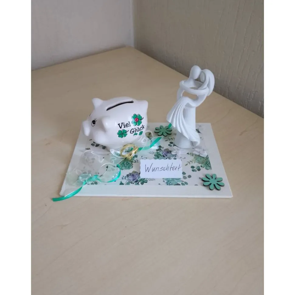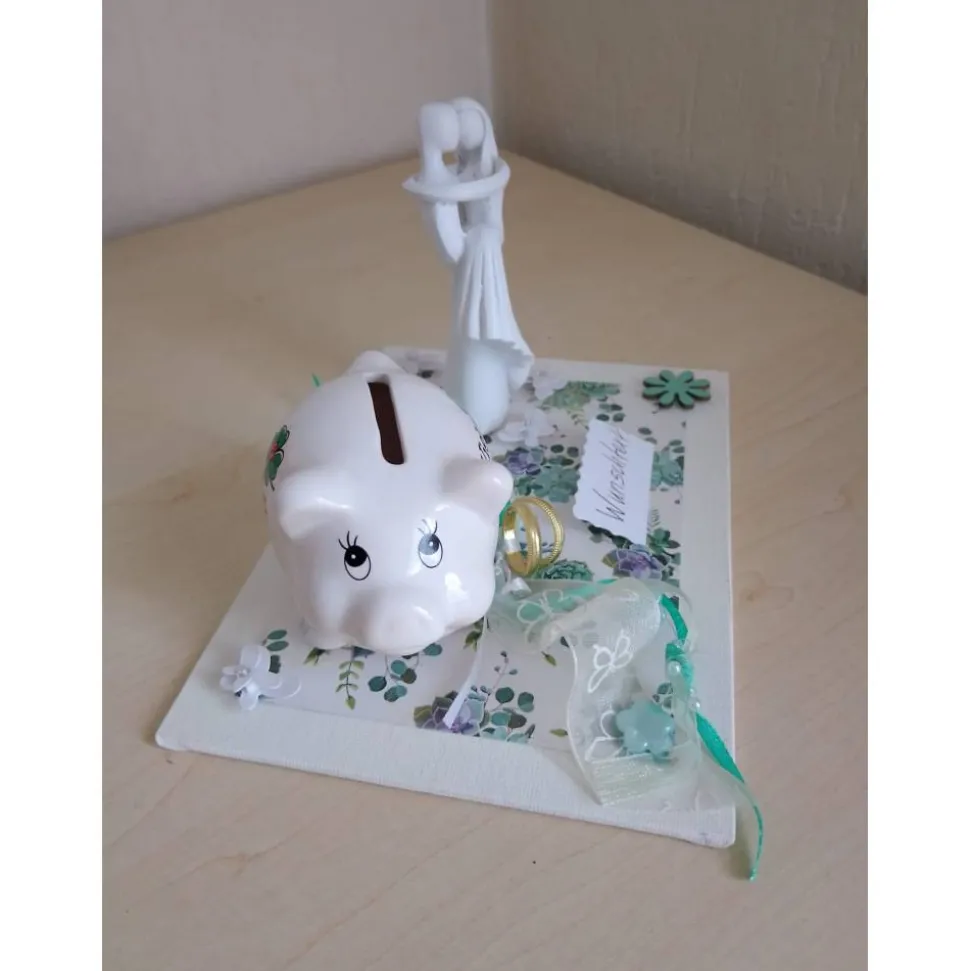 Überrasche das Brautpaar mit einem einzigartigen Geldgeschenk zur Hochzeit! Statt klassischer Geschenkverpackung präsentierst du hier ein handgefertigtes Unikat: Auf einem Leinwandkarton mit den Maßen: 18 x 13 cm wurde stilvolles Motivpapier mit salbeigrünen Sukkulenten-Blüten und -Blättern verarbeitet. Das Highlight ist das kleine Sparschwein mit der Aufschrift „Viel Glück“ – perfekt, um Geldscheine oder kleine Geschenke für die Flitterwochenkasse liebevoll zu überreichen.