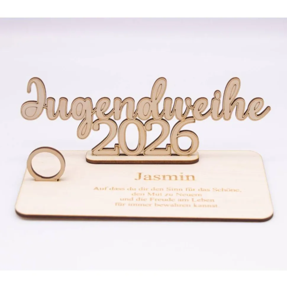Schenken Sie etwas Besonderes zur Jugendweihe 2026! Unser edles Geldgeschenk aus 3 mm unbehandeltem Birkenholz vereint Schlichtheit und Eleganz in einem zeitlosen Design. Das Herzstück des Geschenks ist der kunstvoll gestaltete Schriftzug „Jugendweihe 2026“, der aus hochwertigem Holz präzise gelasert wurde. Individuell und persönlich: Auf der stabilen Grundplatte wird ein schöner Spruch eingraviert, der nach Ihren Wünschen angepasst werden kann. Zudem personalisieren wir das Geschenk mit dem Namen des Beschenkten, um es zu einem ganz persönlichen Andenken zu machen. Hochwertige Gravur: Die Gravur erfolgt mit modernster Lasertechnik direkt in das Holz, was eine präzise und dauerhafte Schrift garantiert. Die Kombination aus natürlichem Holz und feinster Gravur macht dieses Geschenk zu einem echten Hingucker. Dieses einzigartige Geldgeschenk ist nicht nur ein schöner Weg, finanzielle Wünsche zu erfüllen, sondern auch eine bleibende Erinnerung an einen besonderen Tag im Leben. Hinweis: Da es sich um ein Naturprodukt handelt, können Farbe und Maserung des Holzes leicht variieren und jedes Stück zu einem Unikat machen. Machen Sie die Jugendweihe 2026 unvergesslich – mit einem Geschenk, das von Herzen kommt! Wichtig! Der Geldscheinhalter wird in Einzelteilen geliefert. Diese müssen zusammengesteckt und verklebt werden. Der Klebstoff ist nicht im Lieferumfang enthalten. Bestellungen, die von Montag bis Sonntag bis 18 Uhr eingehen, werden noch am selben Tag von uns produziert und am folgenden Werktag (Montag bis Freitag) versendet. Hergestellt von: SandavDesigns – David Müller Kirchgasse 16, 99887 Georgenthal