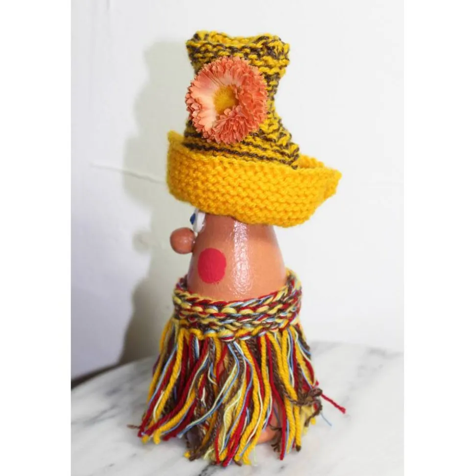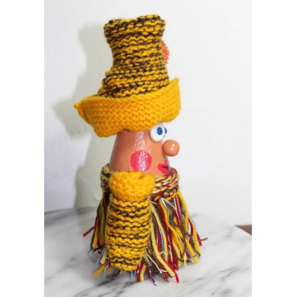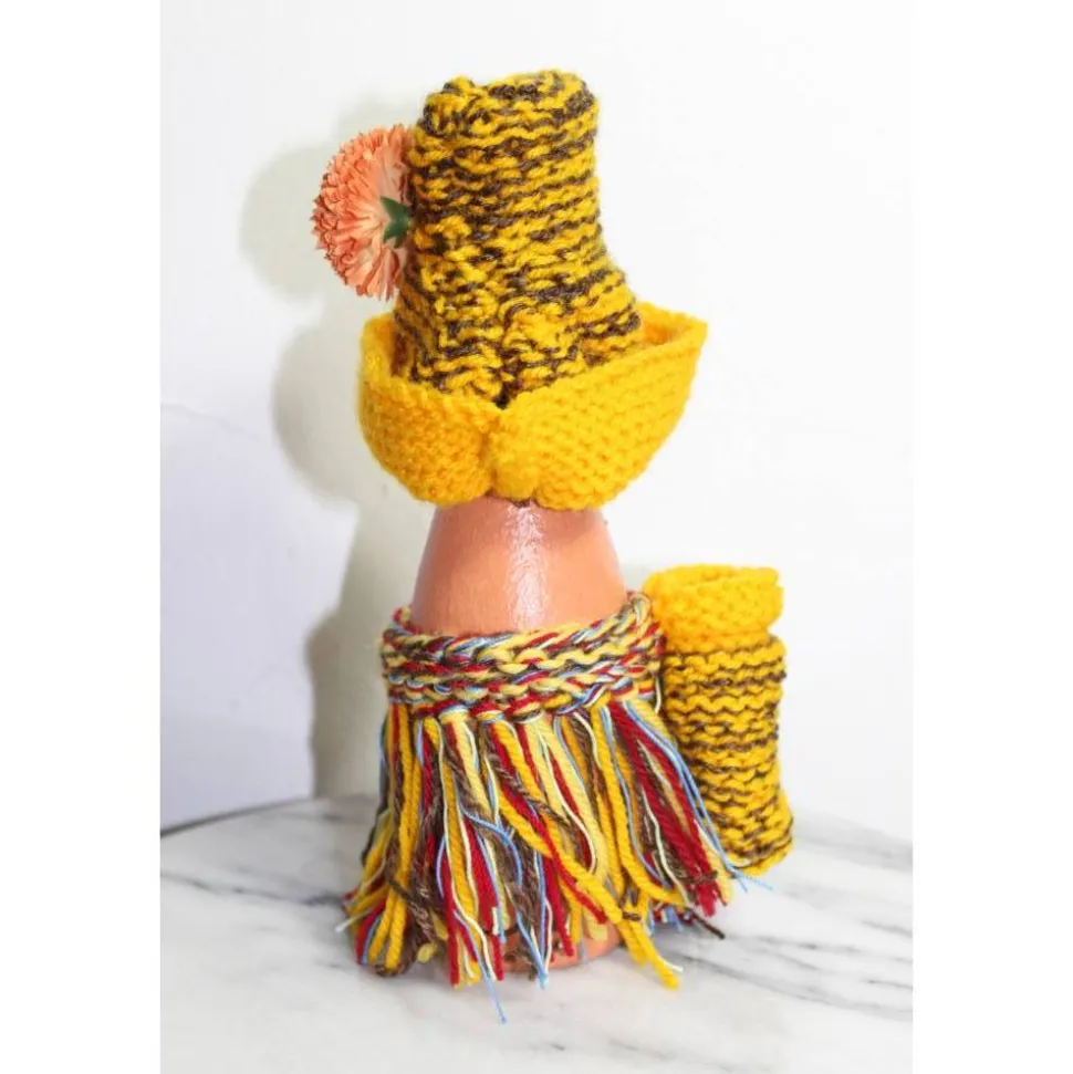 Witzige Figur aus einer Glasflasche. Upcycling-Projekt, gestaltet mit Acrylfarbe und handgestrickten Accessoires. Am Wollmützchen ist eine künstliche Blüte befestigt. Kann als Geldgeschenk verwendet werden, indem man einen Geldschein seitlich in das Täschchen einsteckt :), siehe Beispielfoto.
