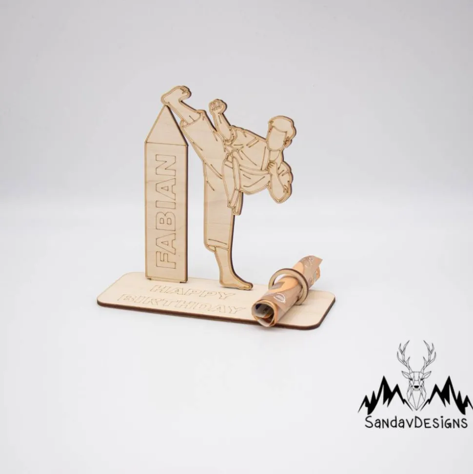 Überraschen Sie den Karate-Enthusiasten in Ihrem Leben mit diesem meisterhaft gefertigten, personalisierten Geldgeschenk aus Holz. Es ist nicht nur eine elegante Möglichkeit, ein Geldgeschenk zu überreichen, sondern auch ein Andenken, das mit Liebe und Respekt für die Kunst des Karate gefertigt wurde.