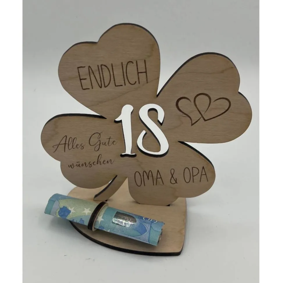 Verschenke ein einzigartiges Geldgeschenk zum 18. Geburtstag: Das Kleeblatt aus 3 mm starkem Birkenholz ist wahlweise in 12,5 cm x 12,5 cm oder 18 cm Größe erhältlich. Die herzförmige Grundplatte misst 9,5 cm x 8,5 cm und bietet sicheren Halt für das stilvolle Kleeblatt mit ausgeschnittener Jahreszahl.