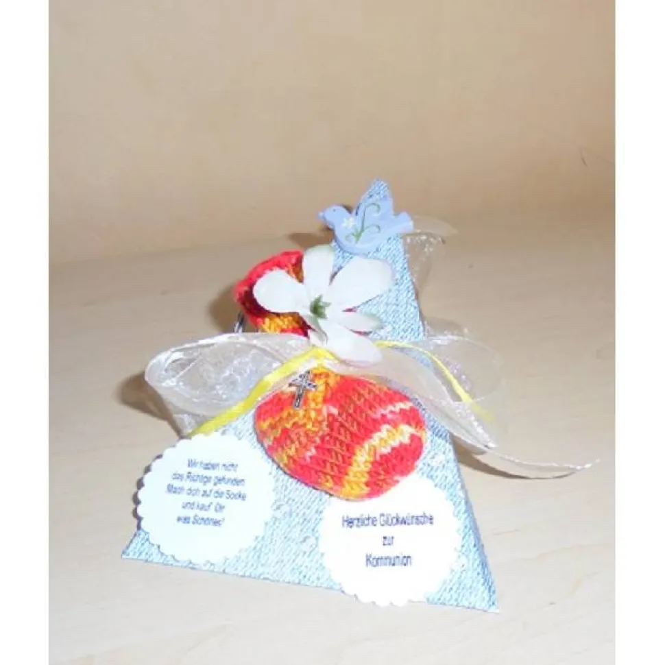 Entdecke die perfekte Alternative zur klassischen Geschenkverpackung: Die Dreieckschachtel mit liebevoll ausgewählter Stricksocke als Schlüsselanhänger ist das ideale Geldgeschenk zur Konfirmation, Kommunion oder Taufe. Die dekorative Socke bietet Platz für Geldscheine oder Gutscheine und eignet sich gleichzeitig als praktischer Begleiter für den Alltag, denn darin lässt sich auch ein Wagenchip verstauen.