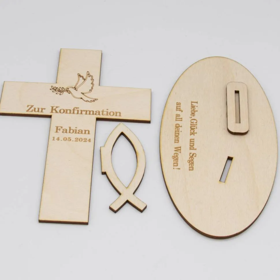 Geldgeschenk Konfirmation - Kreuz - aus Holz personalisiert