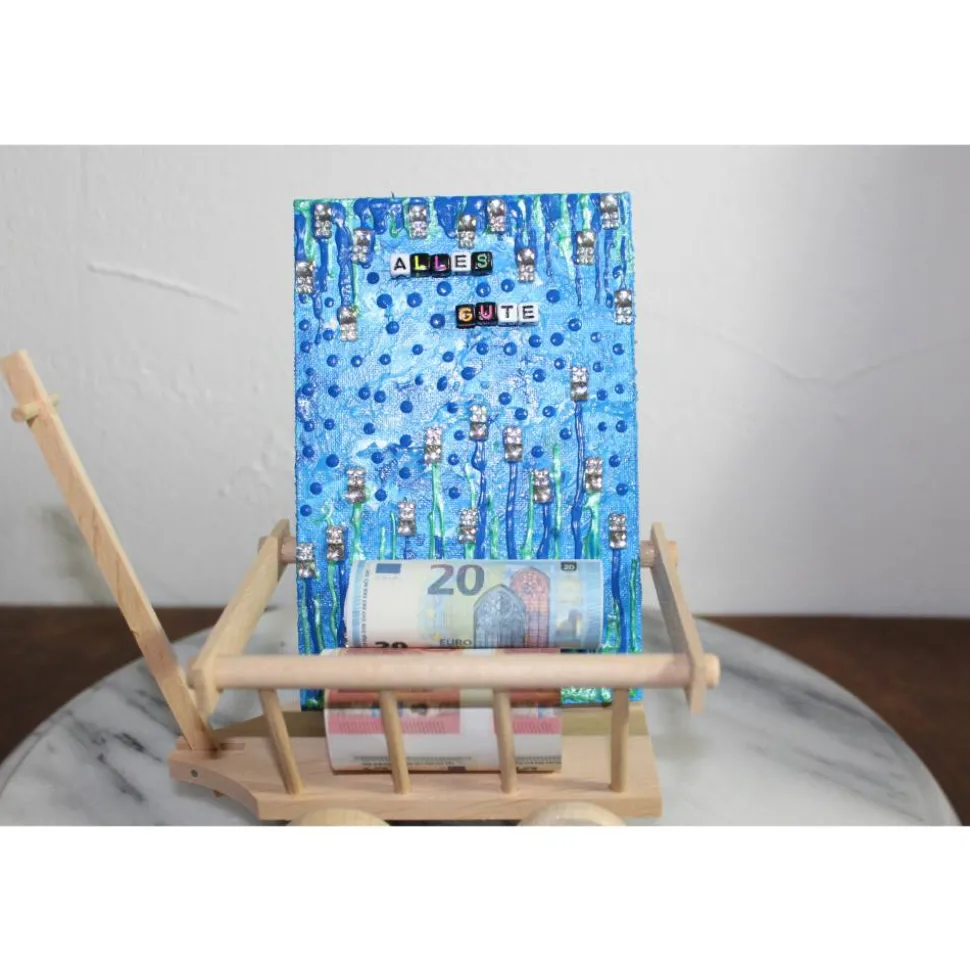Witzige, künstlerische Gestaltung auf einer, mit Leinwand bezogenen, Malplatte. Gestaltet mit Acrylfarbe und Glitzersteinen. Mit Buchstabenwürfeln ist der Schriftzug ALLES GUTE auf der Malplatte angebracht. Als Staffelei wird hier ein kleiner Leiterwagen verwendet. Die Malplatte ist mit einer Klammer am Leiterwagen befestigt. Im Leiterwagen kann man Geldscheine, kleine Briefe, Gutscheine oder kleine Geschenke platzieren, siehe Beispielfoto .