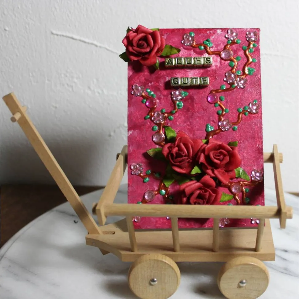 Witzige, künstlerische Gestaltung auf einer, mit Leinwand bezogenen, Malplatte. Gestaltet mit Acrylfarbe, Kunstblumen und Glitzersteinen. Mit Buchstabenwürfeln ist der Schriftzug ALLES GUTE auf der Malplatte angebracht. Als Staffelei wird hier ein kleiner Leiterwagen verwendet. Die Malplatte ist mit einer Klammer am Leiterwagen befestigt. Im Leiterwagen kann man Geldscheine, kleine Briefe, Gutscheine oder kleine Geschenke platzieren, siehe Beispielfoto .